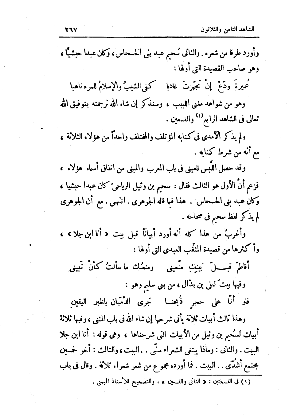 وَهُوَ من شَوَاهِد مُغنِي اللبيب وَسَنذكر إِن شَاءَ الله تَرْجَمته بِتَوْفِيق الله تَعَالَى فِي الشَّاهِد الرَّابِع وَالتسْعين وَلم يذكر الْآمِدِيّ فِي كِتَابه المؤتلف والمختلف وَاحِدًا من هَؤُلَاءِ الثَّلَاثَة مَعَ أَنه من شَرط كِتَابه وَقد حصل اللّبْس للعيني فِي بَاب المعرب والمبنى من اتِّفَاق أَسمَاء هَؤُلَاءِ فَزعم أَن الأول هُوَ الثَّالِث فَقَالَ سحيم بن وثيل الريَاحي كَانَ عبدا حَبَشِيًّا وَكَانَ عبد بني الحسحاس هَذَا فِيمَا قَالَه الْجَوْهَرِي انْتهى مَعَ أَن الْجَوْهَرِي لم يذكر لفظ سحيم فِي صحاحه وَأغْرب من هَذَا كُله أَنه أورد أبياتا قبل بَيت أَنا ابْن جلا وأكثرها من قصيدة المثقب الْعَبْدي الَّتِي أَولهَا (الوافر)