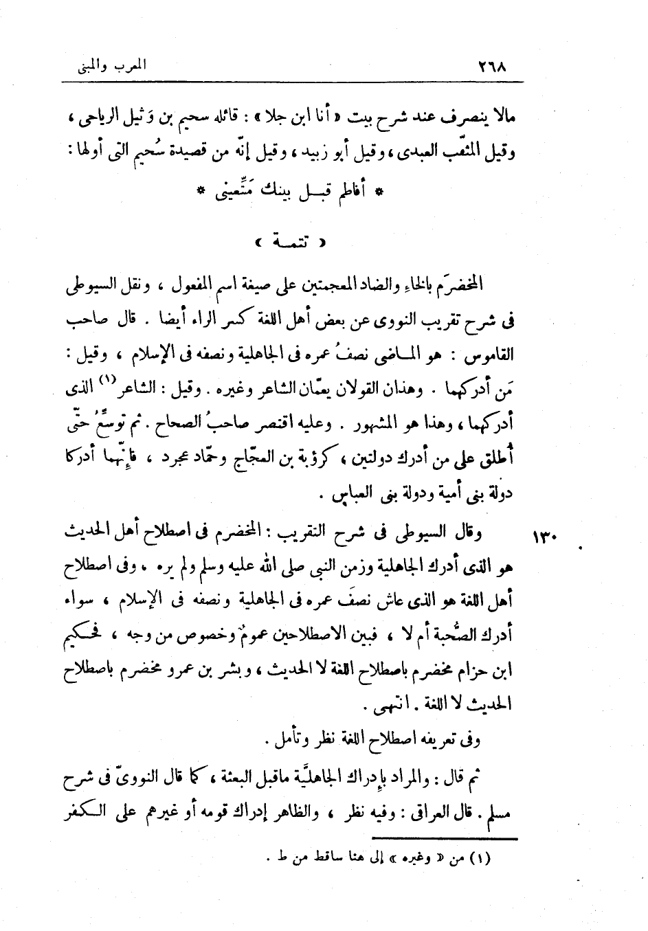 وَلم يره وَفِي اصْطِلَاح أهل اللُّغَة هُوَ الَّذِي عَاشَ نصف عمره فِي الْجَاهِلِيَّة وَنصفه فِي الْإِسْلَام سَوَاء أدْرك الصُّحْبَة أم لَا فَبين الاصطلاحين عُمُوم وخصوص من وَجه فحكيم بن حزَام مخضرم باصطلاح اللُّغَة لَا الحَدِيث وَبشر بن عَمْرو مخضرم باصطلاح الحَدِيث لَا اللُّغَة انْتهى وَفِي تَعْرِيفه اصْطِلَاح اللُّغَة نظر وَتَأمل