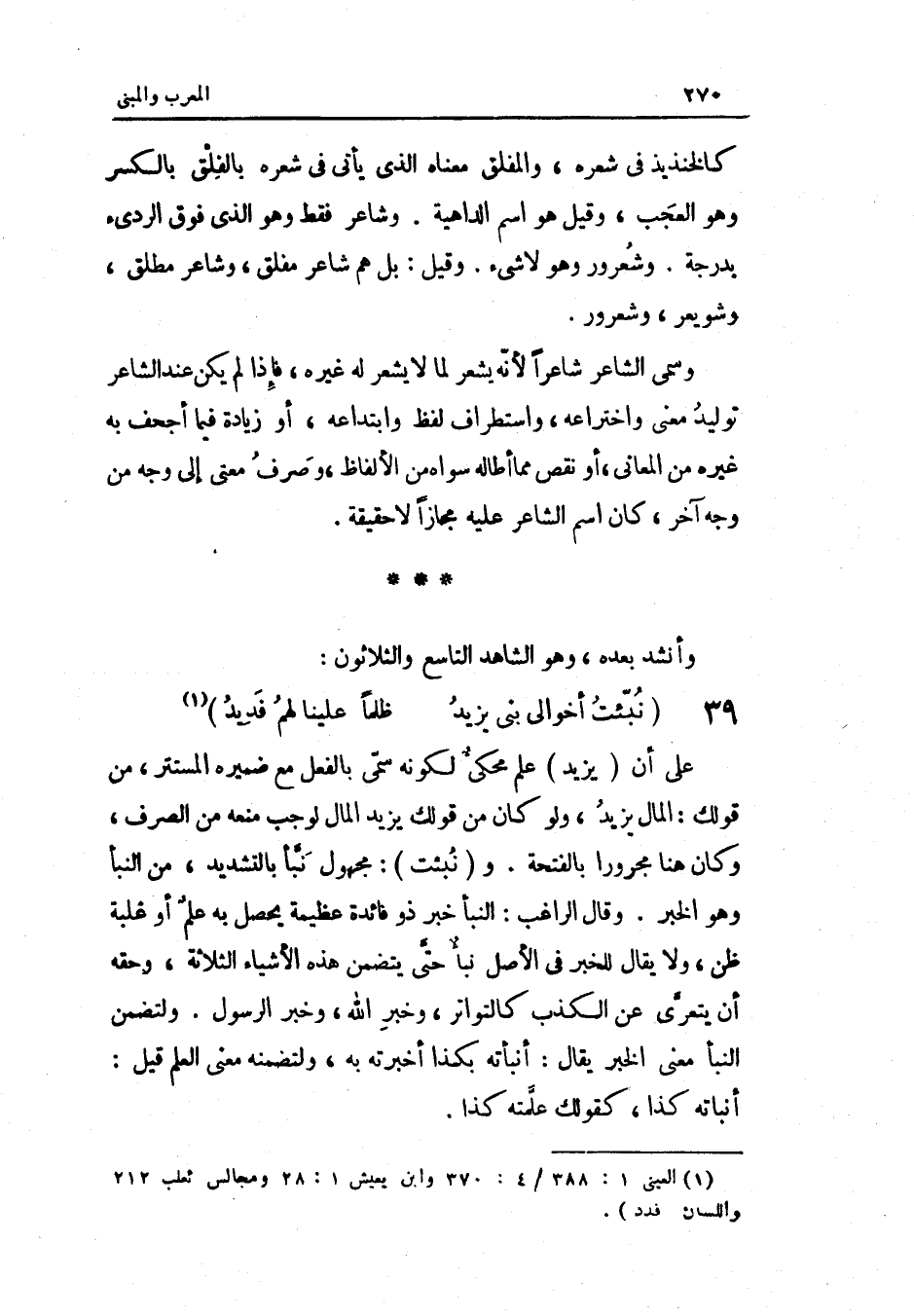 شَاعِر مفلق وشاعر مُطلق وشويعر وشعرور \ وسمى الشَّاعِر شَاعِرًا لِأَنَّهُ يشْعر لما لَا يشْعر لَهُ غَيره فَإِذا لم يكن عِنْد الشَّاعِر توليد معنى واختراعه واستطراف لفظ وابتداعه أَو زِيَادَة فِيمَا أجحف بِهِ غَيره من الْمعَانِي أَو نقص مِمَّا أطاله سواهُ من الْأَلْفَاظ وَصرف معنى إِلَى وَجه من وَجه آخر كَانَ اسْم الشَّاعِر عَلَيْهِ مجَازًا لَا حَقِيقَة وَأنْشد بعده وَهُوَ الشَّاهِد التَّاسِع وَالثَّلَاثُونَ (الرجز)