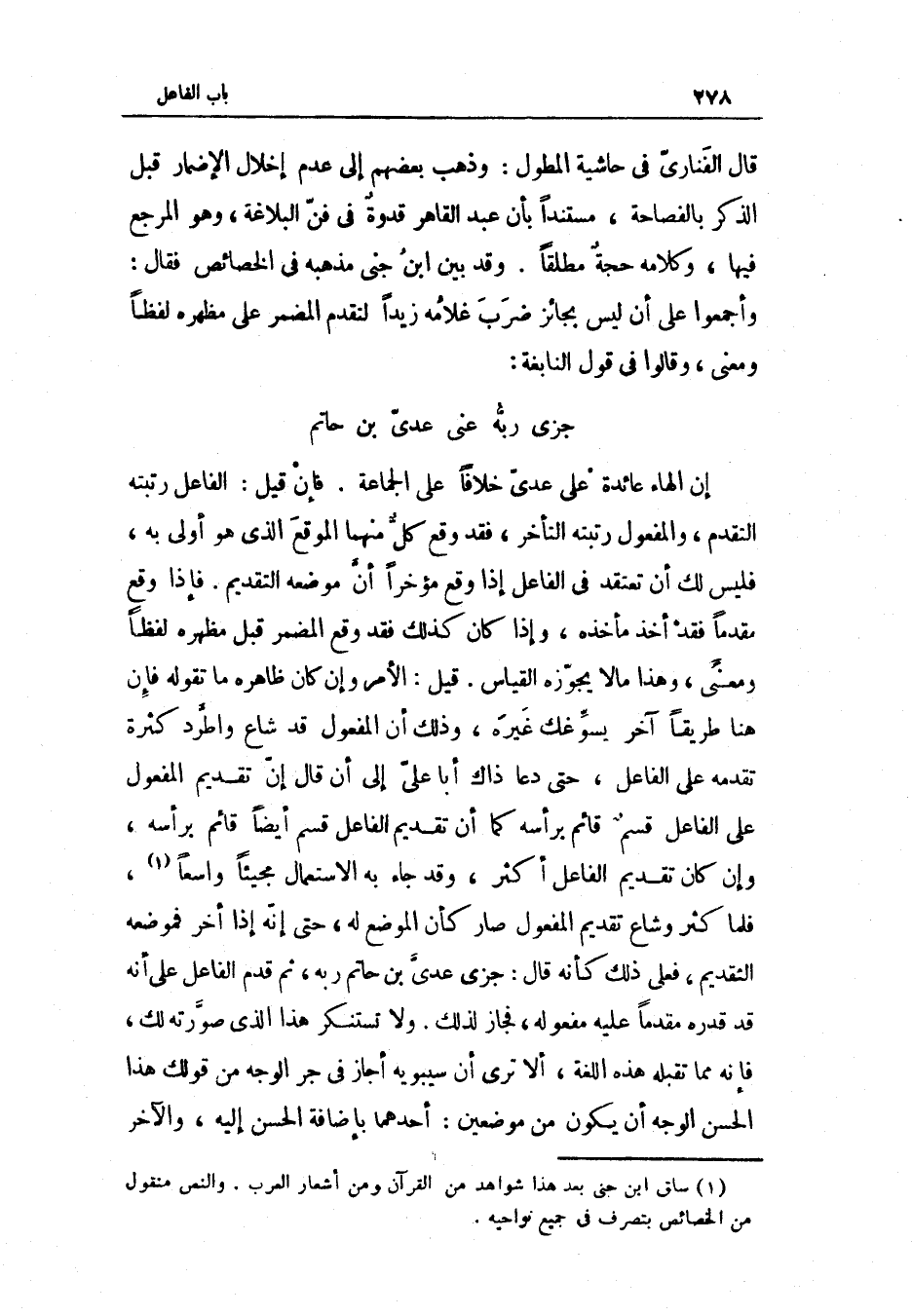 إِن الْهَاء عَائِدَة على عدي خلافًا على الْجَمَاعَة فَإِن قيل الْفَاعِل رتبته التَّقَدُّم وَالْمَفْعُول رتبته التَّأَخُّر فقد وَقع كل مِنْهُمَا الْموقع الَّذِي هُوَ أولى بِهِ فَلَيْسَ لَك أَن تعتقد فِي الْفَاعِل إِذا وَقع مُؤَخرا أَن مَوْضِعه التَّقْدِيم فَإِذا وَقع مقدما فقد أَخذ