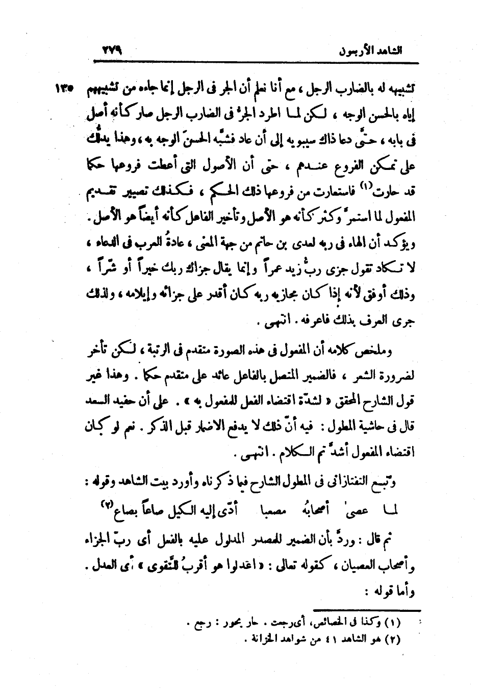 تشبيهه لَهُ بالضارب الرجل مَعَ أَنا نعلم أَن الْجَرّ فِي الرجل إِنَّمَا جَاءَهُ من تشبيههم إِيَّاه بالْحسنِ الْوَجْه لَكِن لما أطْرد الْجَرّ فِي الضَّارِب الرجل صَار كَأَنَّهُ أصل فِي بَابه حَتَّى دَعَا ذَاك سِيبَوَيْهٍ إِلَى أَن عَاد فَشبه الْحسن الْوَجْه بِهِ وَهَذَا يدلك على تمكن الْفُرُوع عِنْدهم حَتَّى أَن الْأُصُول الَّتِي أَعْطَتْ فروعها حكما قد حارت فاستعارت من فروعها ذَلِك الحكم فَكَذَلِك تصيير تَقْدِيم الْمَفْعُول لما اسْتمرّ وَكثر كَأَنَّهُ هُوَ الأَصْل وَتَأْخِير الْفَاعِل كَأَنَّهُ أَيْضا هُوَ الأَصْل ويؤكد أَن الْهَاء فِي ربه لعدي بن حَاتِم من جِهَة الْمَعْنى عَادَة الْعَرَب فِي الدُّعَاء لَا تكَاد تَقول جزى رب زيد عمرا وَإِنَّمَا يُقَال جَزَاك رَبك خيرا أَو شرا وَذَلِكَ أوفق لِأَنَّهُ إِذا كَانَ مجازيه ربه كَانَ أقدر على جَزَائِهِ وإيلامه وَلذَلِك جرى الْعرف بذلك فاعرفه انْتهى وَمُلَخَّص كَلَامه أَن الْمَفْعُول فِي هَذِه الصُّورَة مُتَقَدم فِي الرُّتْبَة لَكِن تَأَخّر لضَرُورَة الشّعْر فَالضَّمِير الْمُتَّصِل بالفاعل عَائِد على مُتَقَدم حكما وَهَذَا غير قَول الشَّارِح الْمُحَقق لشدَّة اقْتِضَاء الْفِعْل للْمَفْعُول بِهِ على أَن حفيد السعد قَالَ فِي حَاشِيَة المطول فِيهِ أَن ذَلِك لَا يدْفع الْإِضْمَار