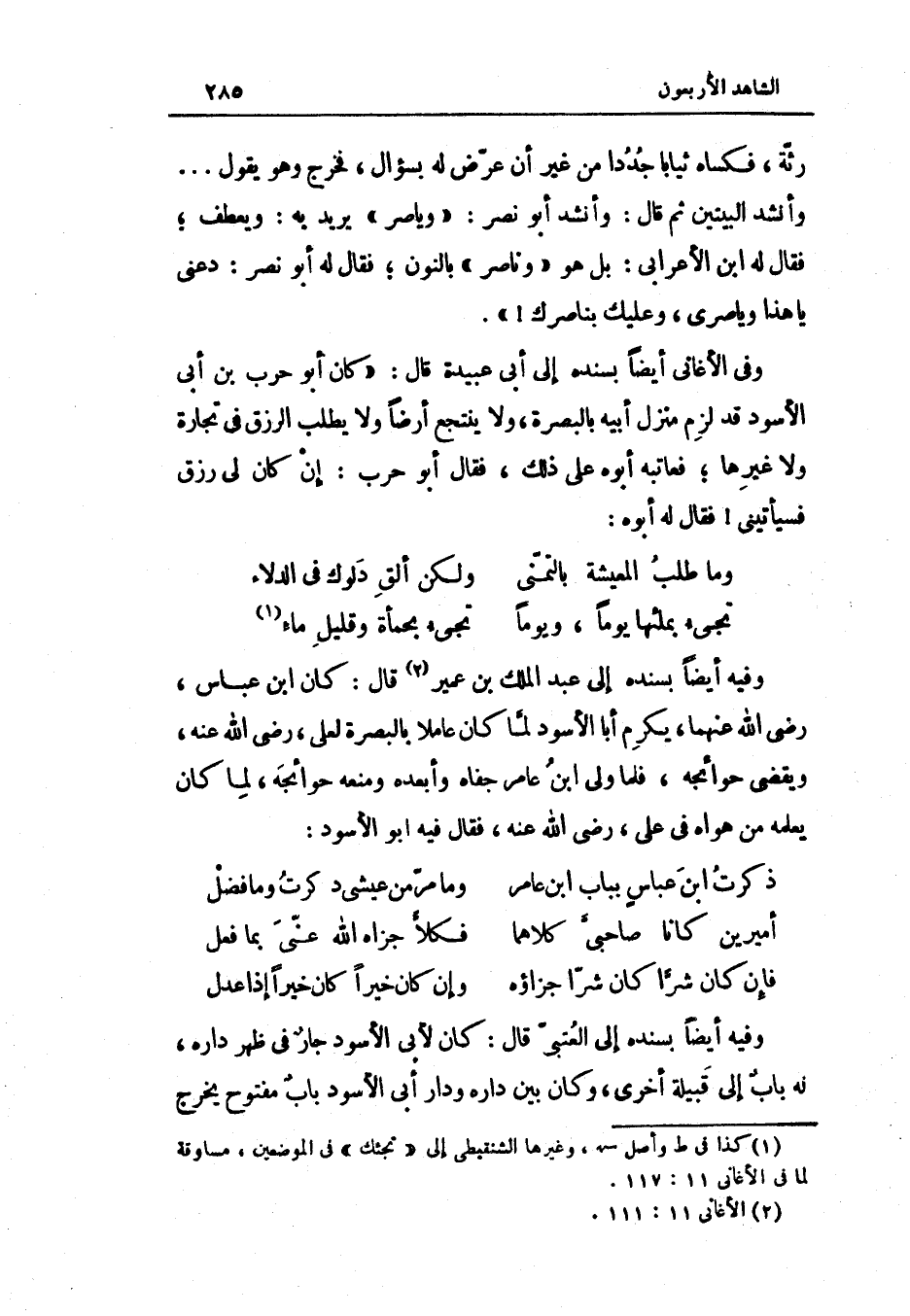 وَفِيه أَيْضا بِسَنَدِهِ إِلَى عبد الْملك بن عُمَيْر قَالَ كَانَ ابْن عَبَّاس رَضِيَ اللَّهُ عَنْه يكرم أَبَا الْأسود لما كَانَ عَاملا بِالْبَصْرَةِ لعَلي رَضِيَ اللَّهُ عَنْه وَيَقْضِي حوائجة فَلَمَّا ولي ابْن عَامر جفاه وأبعده وَمنعه حَوَائِجه لما كَانَ يُعلمهُ من هَوَاهُ فِي عَليّ رَضِيَ اللَّهُ عَنْه فَقَالَ فِيهِ أَبُو الْأسود (الطَّوِيل)
