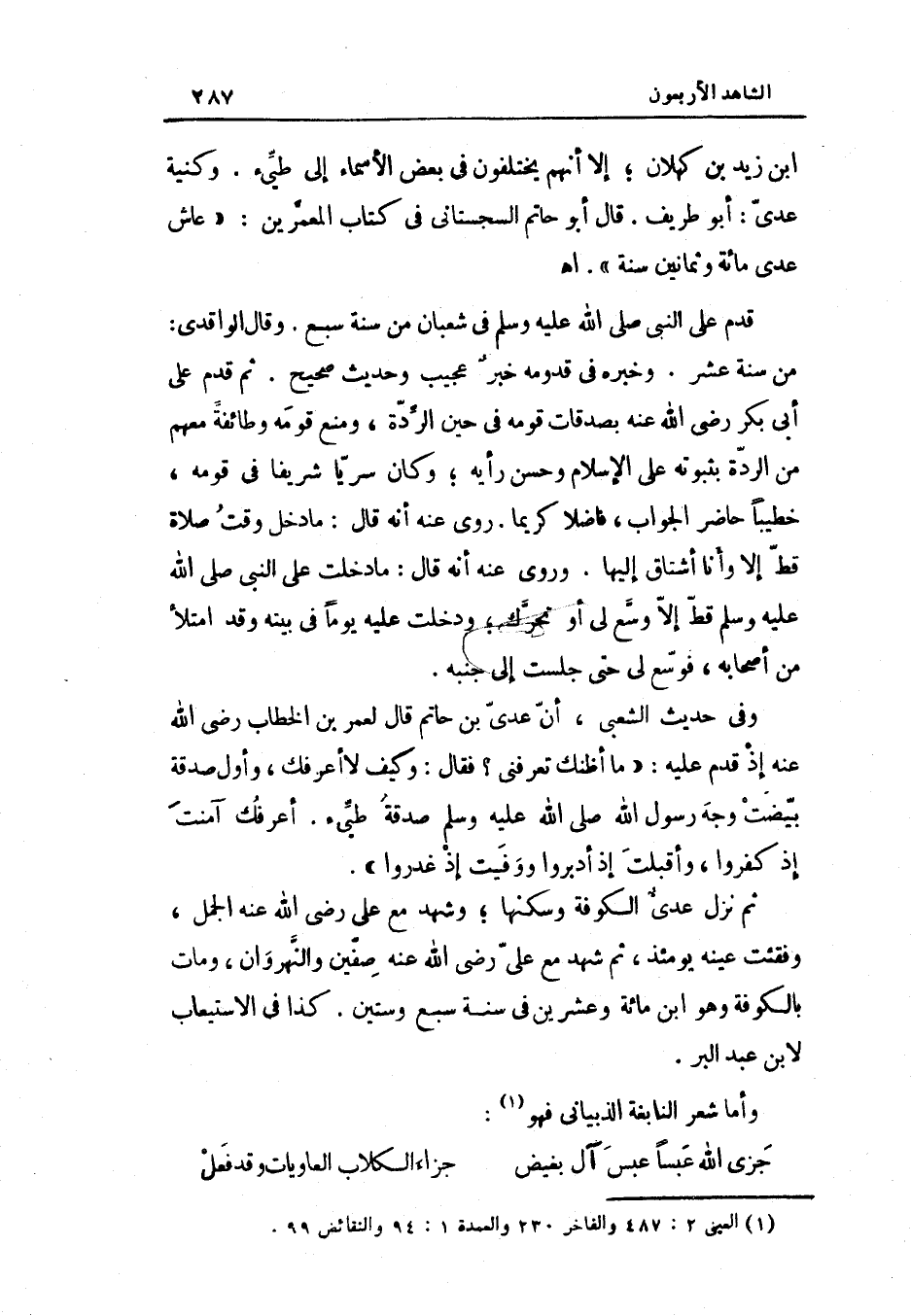 صَدَقَة طَيئ أعرفك آمَنت إِذْ كفرُوا وَأَقْبَلت إِذْ أدبروا ووفيت إِذْ غدروا ثمَّ نزل عدي الْكُوفَة وسكنها وَشهد مَعَ عَليّ رَضِيَ اللَّهُ عَنْه الْجمل وفقئت عينه يَوْمئِذٍ ثمَّ شهد مَعَ عَليّ رَضِيَ اللَّهُ عَنْه صفّين والنهروان وَمَات بِالْكُوفَةِ وَهُوَ ابْن مائَة وَعشْرين فِي سنة سبع وَسِتِّينَ كَذَا فِي الِاسْتِيعَاب لِابْنِ عبد الْبر وَأما شعر النَّابِغَة الذبياني فَهُوَ (الطَّوِيل)