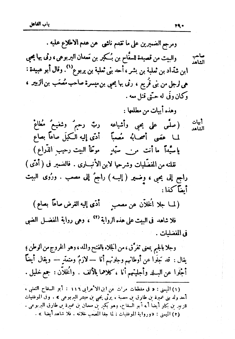 ومرجع الضميرين على مَا تقدم نَاشِئ عَن عدم الِاطِّلَاع عَلَيْهِ وَالْبَيْت من قصيدة للسفاح بن بكير بن معدان الْيَرْبُوعي رثى بهَا يحيى بن شَدَّاد ابْن ثَعْلَبَة بن بشر أحد بني ثَعْلَبَة بن يَرْبُوع وَقَالَ أَبُو عُبَيْدَة هِيَ لرجل من بني قريع رثى بهَا يحيى بن ميسرَة صَاحب مُصعب بن الزبير وَكَانَ وَفِي لَهُ حَتَّى قتل مَعَه وَهَذِه أَبْيَات من مطْلعهَا (السَّرِيع)