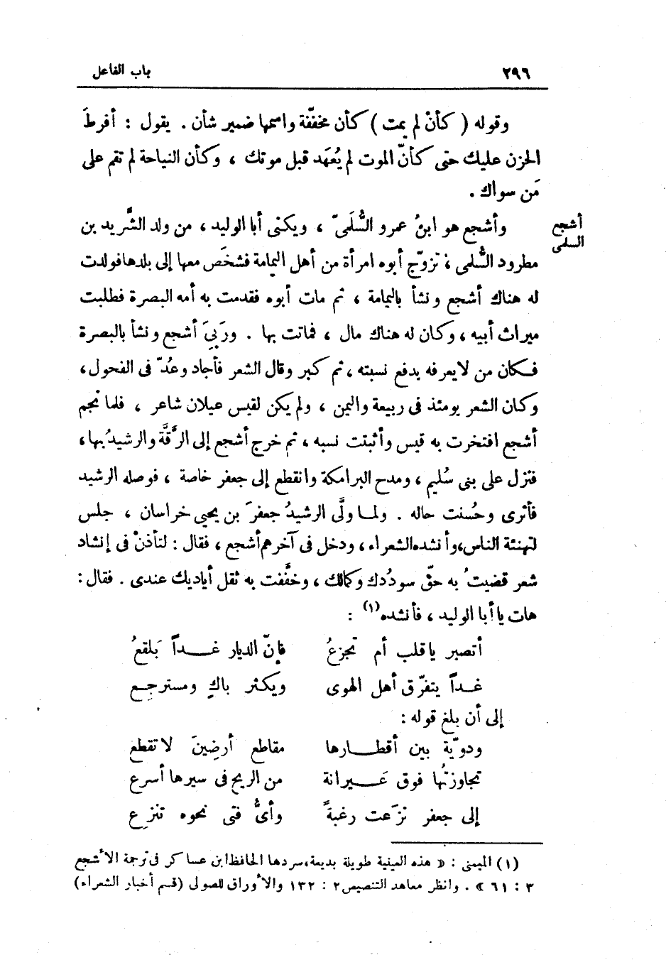 وَقَوله كَأَن لم يمت كَأَن مخففه وَاسْمهَا ضمير شَأْن يَقُول أفرط الْحزن عَلَيْك حَتَّى كَانَ الْمَوْت لم يعْهَد قبل موتك وَكَأن النِّيَاحَة لم تقم على من سواك وَأَشْجَع هُوَ ابْن عَمْرو السّلمِيّ ويكنى أَبَا الْوَلِيد من ولد الشريد بن مطرود السّلمِيّ وَتزَوج أَبوهُ امْرَأَة من أهل الْيَمَامَة فشخص مَعهَا إِلَى بَلَدهَا فَولدت لَهُ هُنَاكَ أَشْجَع وَنَشَأ بِالْيَمَامَةِ ثمَّ مَاتَ أَبوهُ فَقدمت بِهِ أمه الْبَصْرَة فطلبت مِيرَاث أَبِيه وَكَانَ لَهُ هُنَاكَ مَال فَمَاتَتْ بهَا وربي أَشْجَع وَنَشَأ بِالْبَصْرَةِ فَكَانَ من لَا يعرفهُ يدْفع نسبته ثمَّ كبر وَقَالَ الشّعْر فأجاد وعد فِي الفحول وَكَانَ الشّعْر يؤمئذ فِي ربيعَة واليمن وَلم يكن لقيس عيلان شَاعِر فَلَمَّا نجم أَشْجَع افتخرت بِهِ قيس واثبتت نسبه ثمَّ خرج أَشْجَع إِلَى الرقة والرشيد بهَا فَنزل على بني سليم ومدح البرامكة وَانْقطع إِلَى جَعْفَر خَاصَّة فوصله الرشيد فأثرى وَحسنت حَاله وَلما ولى الرشيد جَعْفَر بن يحيى خُرَاسَان جلس لتهنئة النَّاس وأنشده الشُّعَرَاء وَدخل فِي آخِرهم أَشْجَع فَقَالَ لتأذن فِي إنشاد شعر قضيت بِهِ حق سوددك وكمالك وخففت بِهِ ثقل أياديك عِنْدِي فَقَالَ هَات يَا أَبَا الْوَلِيد فأنشده (المتقارب)