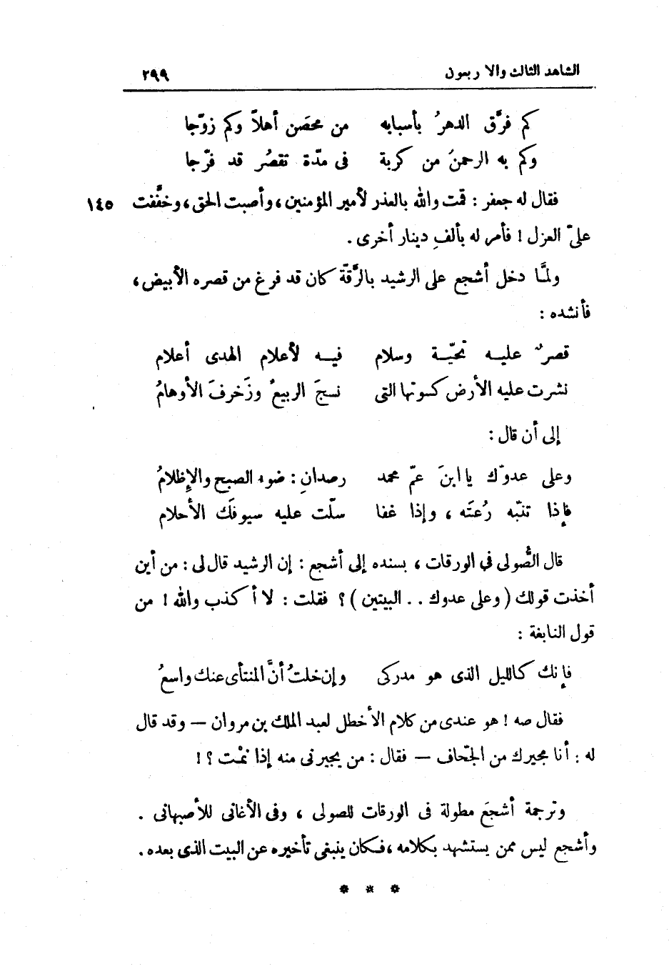فَقَالَ صه هُوَ عِنْدِي من كَلَام الأخطل لعبد الْملك بن مَرْوَان وَقد قَالَ لَهُ أَنا مجيرك من الجحاف فَقَالَ من يجيرني مِنْهُ إِذا نمت وترجمة أَشْجَع مُطَوَّلَة فِي الورقات للصولي وَفِي الأغاني للأصبهاني وَأَشْجَع لَيْسَ مِمَّن يستشهد بِكَلَامِهِ فَكَانَ يَنْبَغِي تَأْخِيره عَن الْبَيْت الَّذِي بعده