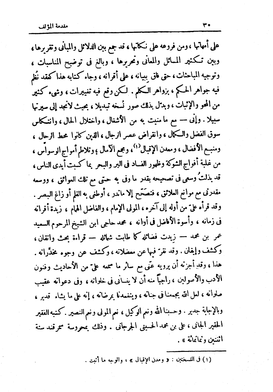 على أمهاتها وَمن فروعه على نكاتها قد جمع بَين الدَّلَائِل والمباني وتقريرها وَبَين تَكْثِير الْمسَائِل والمعاني وتحريرها وَبَالغ فِي توضيح المناسبات وتوجيه المباحثات حَتَّى فاق ببيانه على أقرانه وَجَاء كِتَابه هَذَا كعقد نظم فِي جَوَاهِر الحكم بزواهر الْكَلم لَكِن وَقع فِيهِ تغييرات وَشَيْء كثير من المحور والإنبات وَبدل بذلك صور نُسْخَة تبديلا بِحَيْثُ لَا نجد إِلَى سيرتها سَبِيلا وَإِنِّي مَعَ مَا منيت بِهِ من الأشغال واختلال الْحَال وانتكاس سوق الْفضل والكمال وانقراض عصر الرِّجَال الَّذين كَانُوا محط الرّحال ومنبع الأفضال ومعدن الإقبال وَمجمع الآمال وتلاطم أمواج الوسواس من غَلَبَة أَفْوَاج الشَّوْكَة وَظُهُور الْفساد فِي الْبر وَالْبَحْر بِمَا كسبت أَيدي النَّاس قد بذلت وسعي فِي تَصْحِيحه بِقدر مَا وَفِي بِهِ حسي مَعَ تِلْكَ الْعَوَائِق ووسعه مقدرتي مَعَ مَوَانِع الْعَوَائِق فتصحح إِلَّا مَا ندر أَو طَغى بِهِ الْقَلَم أَو زاغ الْبَصَر وَقد قَرَأَهُ على من أَوله إِلَى آخِره الْمولى الإِمَام والفاضل الْهمام زبدة أقرانه فِي زَمَانه وأسوة الأفاضل فِي أَوَانه مُحَمَّد حاجي ابْن الشَّيْخ المرحوم السعيد عمر بن مُحَمَّد زيدت فضائله كَمَا طابت شمائله قِرَاءَة بحث وإتقان وكشف وإيقان وَقد نقر فِيهَا عَن معضلاته وكشف عَن وُجُوه مخدراته هَذَا وَقد أجزته أَن يرويهِ عني مَعَ سَائِر مَا سَمعه عَليّ من الْأَحَادِيث وفنون الْأَدَب والأصولين راجيا مِنْهُ أَن لَا ينساني فِي خلواته وَفِي دعواته عقيب صلواته لَعَلَّ الله يجمعنا فِي جناته ويتغمدنا بمرضاته إِنَّه على مَا يَشَاء قدير وبالإجابة جدير وحسبنا الله وَنعم الْوَكِيل نعم الْمولى وَنعم النصير كتبه الْفَقِير الحقير الْجَانِي عَليّ بن مُحَمَّد الْحُسَيْنِي الْجِرْجَانِيّ وَذَلِكَ بمحروسة سَمَرْقَنْد سنة اثْنَتَيْنِ وَثَمَانمِائَة