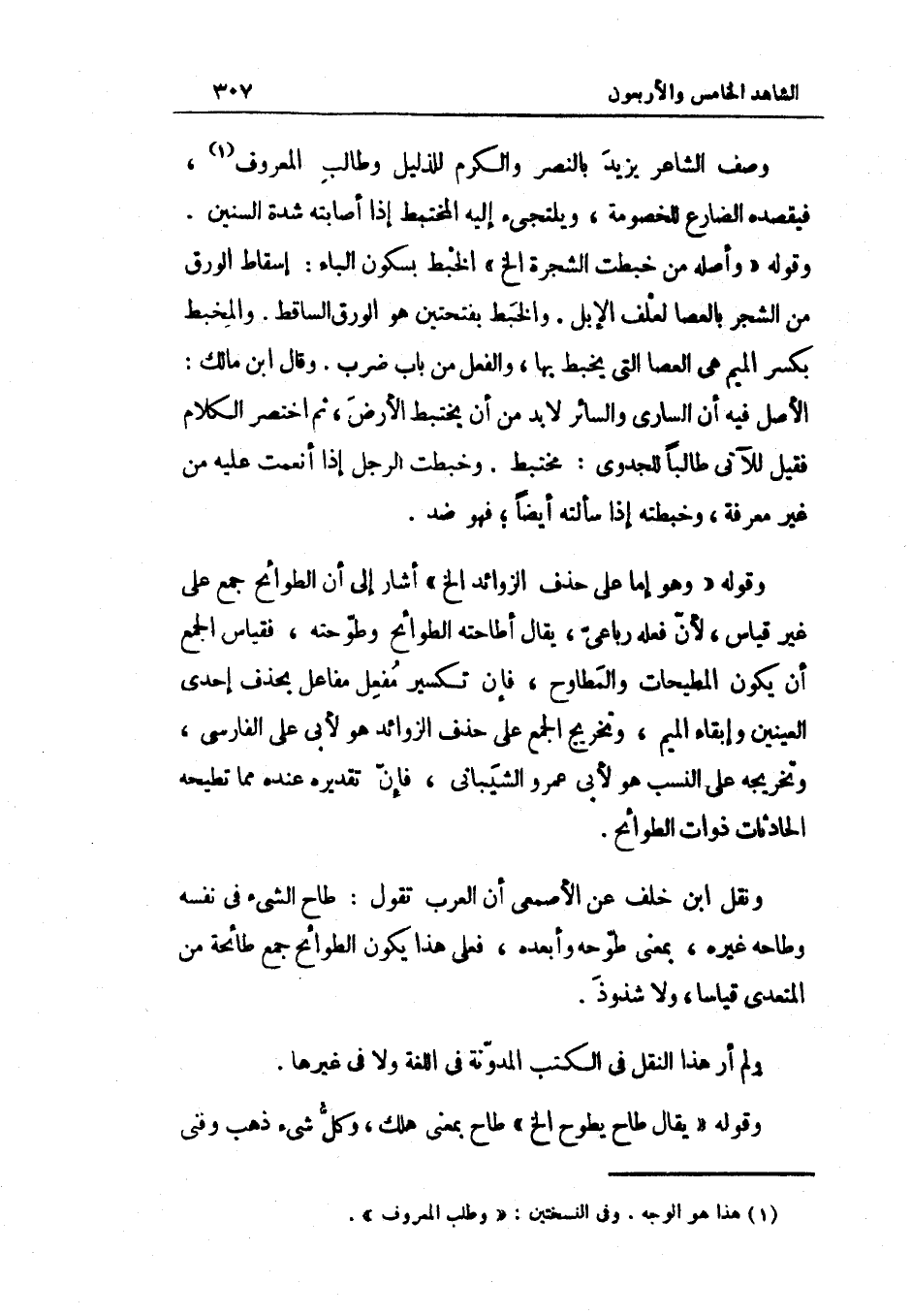 وصف الشَّاعِر يزِيد بالنصر وَالْكَرم للذليل وطالب الْمَعْرُوف فيقصده الضارع للخصومة ويلتجىء إِلَيْهِ المختبط إِذا أَصَابَته شدَّة السنين وَقَوله وَأَصله من خبطت الشَّجَرَة إِلَخ الْخبط بِسُكُون الْبَاء إِسْقَاط الْوَرق من الشّجر بالعصا لعلف الْإِبِل والخبط بِفتْحَتَيْنِ هُوَ الْوَرق السَّاقِط والمخبط بِكَسْر الْمِيم هِيَ الْعَصَا الَّتِي يخبط بهَا وَالْفِعْل من بَاب ضرب وَقَالَ ابْن مَالك الأَصْل فِيهِ أَن الساري والسائر لابد من أَن يختبط الأَرْض ثمَّ اختصر الْكَلَام فَقيل للآتي طَالبا للجدوى مختبط وخبطت الرجل إِذا أَنْعَمت عَلَيْهِ من غير معرفَة وخبطته إِذا سَأَلته أَيْضا فَهُوَ ضد وَقَوله وَهُوَ إِمَّا على حذف الزَّوَائِد إِلَخ أَشَارَ إِلَى أَن الطوائح جمع على غير قِيَاس لِأَن فعله رباعي يُقَال أطاحته الطوائح وطوحته فَقِيَاس الْجمع أَن يكون المطيحات والمطارح فَإِن تكسير مفعل مفاعل بِحَذْف إِحْدَى الْعَينَيْنِ وإبقاء الْمِيم وَتَخْرِيج الْجمع على حذف الزَّوَائِد هُوَ لأبي عَليّ الْفَارِسِي وتخريجه على النّسَب هُوَ لأبي عَمْرو الشَّيْبَانِيّ فَإِن تَقْدِيره عِنْده مِمَّا تطيحه الحادثات ذَوَات الطوائح وَنقل ابْن خلف عَن الْأَصْمَعِي أَن الْعَرَب تَقول طاح الشَّيْء بِنَفسِهِ وطاحه غَيره بِمَعْنى طوحه وأبعده فعلى هَذَا تكون الطوائح جمع طائحة من الْمُتَعَدِّي قِيَاسا وَلَا شذوذ وَلم أر هَذَا النَّقْل فِي الْكتب المدونه فِي اللُّغَة وَلَا فِي غَيرهَا وَقَوله يُقَال طاح يطوح إِلَخ طاح بِمَعْنى هلك وكل شَيْء ذهب وفني