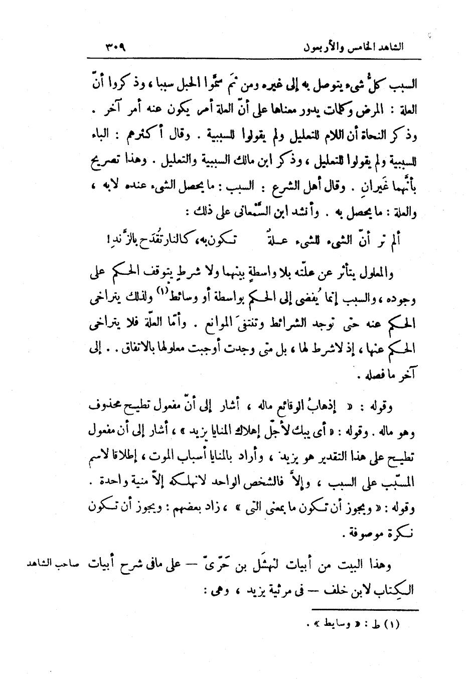 عَنهُ حَتَّى تُوجد الشَّرَائِط وتنتفي الْمَوَانِع وَأما الْعلَّة فَلَا يتراخى الحكم عَنْهَا إِذْ لَا شَرط لَهَا بل مَتى وجدت أوجبت معلولها بالِاتِّفَاقِ إِلَى آخر مَا فَصله وَقَوله إذهاب الوقائع مَاله أَشَارَ إِلَى أَن مفعول تطيح مَحْذُوف وَهُوَ مَاله وَقَوله أَي يبك لأجل إهلاك المنايا يزِيد أَشَارَ إِلَى أَن مفعول تطيح على هَذَا التَّقْدِير هُوَ يزِيد وَأَرَادَ بالمنايا أَسبَاب الْمَوْت إطلاقا لاسم الْمُسَبّب على السَّبَب وَإِلَّا فالشخص الْوَاحِد لَا تهلكه إِلَّا منية وَاحِدَة وَقَوله وَيجوز أَن تكون مَا بِمَعْنى الَّتِي زَاد بَعضهم وَيجوز أَن تكون نكرَة مَوْصُوفَة وَهَذَا الْبَيْت من أَبْيَات لنهشل بن حري على مَا فِي شرح أَبْيَات الْكتاب لِابْنِ خلف فِي مرثية يزِيد وَهِي