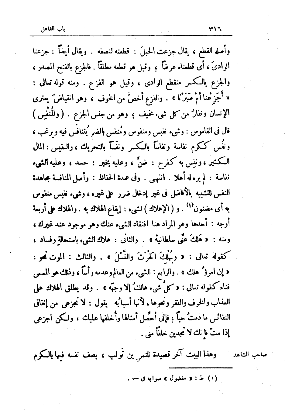 وَقيل هُوَ قِطْعَة مُطلقًا فالجزع بِالْفَتْح الْمصدر والجزع بِالْكَسْرِ مُنْقَطع الْوَادي وَقيل هُوَ الْفَزع وَمِنْه قَوْله تَعَالَى {أجزعنا أم صَبرنَا} والفزع أخص من الْخَوْف وَهُوَ انقباض يعتري الْإِنْسَان ونفار من كل شَيْء مخيف وَهُوَ من جنس الْجزع والمنفس قَالَ فِي الْقَامُوس وَشَيْء نَفِيس ومنفوس ومنفس بِالضَّمِّ يتنافس فِيهِ ويرغب وَنَفس ككرم نفاسه ونفاسا بِالْكَسْرِ ونفسا بِالتَّحْرِيكِ والنفيس المَال الْكثير وَنَفس بِهِ كفرح ضن وَعَلِيهِ بِخَير حسد وَعَلِيهِ الشَّيْء نفاسه لم يره لَهُ أَهلا انْتهى وَفِي عُمْدَة الْحفاظ وأصل المنافسة مجاهدة النَّفس للتشبيه بالأفاضل فِي غير إِدْخَال ضَرَر على غَيره وَشَيْء نَفِيس منفوس بِهِ أَي مضنون والإهلاك لشَيْء إِيقَاع الْهَلَاك بِهِ والهلاك على أَرْبَعَة أوجه أَحدهَا وَهُوَ المُرَاد هُنَا افتقاد الشَّيْء عَنْك وَهُوَ مَوْجُود عِنْد غَيْرك وَمِنْه هلك عني سلطانيه. وَالثَّانِي هَلَاك الشَّيْء باستحالة وَفَسَاد كَقَوْلِه تَعَالَى {وَيهْلك الْحَرْث والنسل} وَالثَّالِث الْمَوْت نَحْو إِن امْرُؤ هلك وَالرَّابِع الشَّيْء من الْعَالم وَعَدَمه رَأْسا وَذَلِكَ هُوَ الْمُسَمّى فنَاء كَقَوْلِه تَعَالَى (كل شَيْء هَالك إِلَّا وَجهه) وَقد يُطلق الْهَلَاك على الْعَذَاب وَالْخَوْف والفقر وَنَحْوهَا لِأَنَّهَا أَسبَابه يَقُول لَا تجزعي من إنفاقي النفائس مَا دمت حَيا فَإِنِّي أحصل أَمْثَالهَا وأخلفها عَلَيْك وَلَكِن أجزعي إِذا مت فَإنَّك لَا تجدين خلفا منى وَهَذَا الْبَيْت آخر قصيدة للنمر بن تولب يصف نَفسه فِيهَا بِالْكَرمِ
