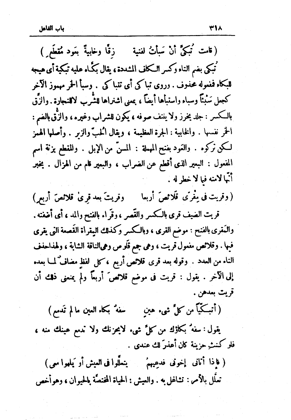 تبْكي بِضَم التَّاء وَكسر الْكَاف الْمُشَدّدَة يُقَال بكاه عَلَيْهِ تبكية اي هيجه للبكاء فمفعوله مَحْذُوف وروى تباكى أَي تتباكى وسبأ الْخمر مَهْمُوز الآخر كجعل سبأ وسباء واستبأها أَيْضا بِمَعْنى اشْتَرَاهَا للشُّرْب لَا للتِّجَارَة والزق بِالْكَسْرِ جلد يخرز وَلَا ينتف صوفه يكون للشراب وَغَيره والزق بِالضَّمِّ الْخمر نَفسهَا والخابية الجرة الْعَظِيمَة وَيُقَال الْحبّ والزير وَأَصلهَا الْهَمْز لَكِن تَرَكُوهُ وَالْعود بِفَتْح الْمُهْملَة المسن من الْإِبِل والمقطع بزنة اسْم الْمَفْعُول