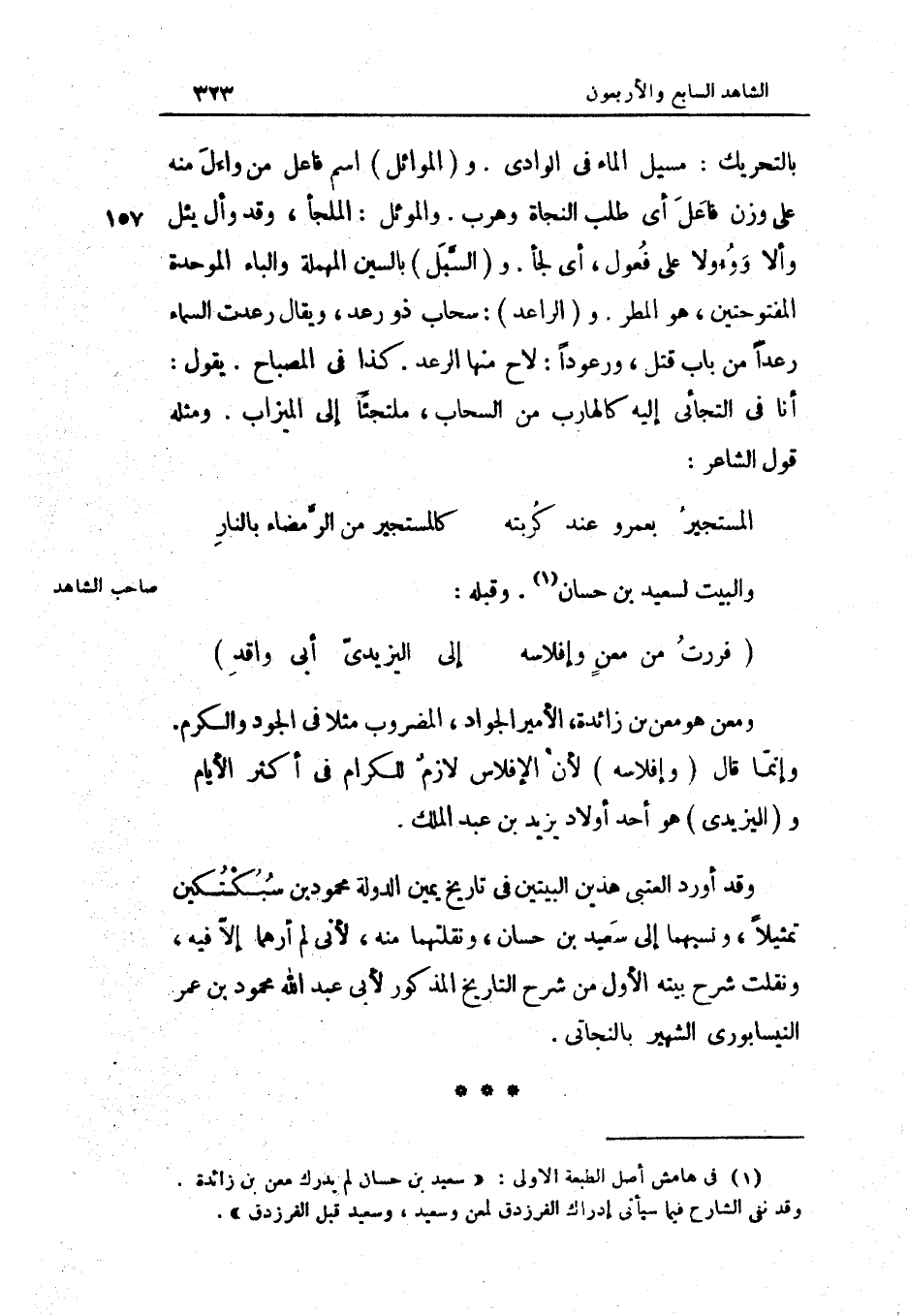 ومعن هُوَ معن بن زَائِدَة الْأَمِير الْجواد الْمَضْرُوب مثلا فِي الْجُود وَالْكَرم وَإِنَّمَا قَالَ وإفلاسه لِأَن الإفلاس لَازم للكرام فِي أَكثر الْأَيَّام واليزيدي هُوَ أحد أَوْلَاد يزِيد بن عبد الْملك وَقد أورد الْعُتْبِي هذَيْن الْبَيْتَيْنِ فِي تَارِيخ يَمِين الدولة مَحْمُود بن سبكتكين تمثيلا ونسبهما إِلَى سعيد بن حسان ونقلتهما مِنْهُ لِأَنِّي لم أرهما إِلَّا فِيهِ ونقلت شرح بَيته الأول من شرح التَّارِيخ الْمَذْكُور لأبي عبد الله مَحْمُود بن عمر النَّيْسَابُورِي الشهير بالنجاتي