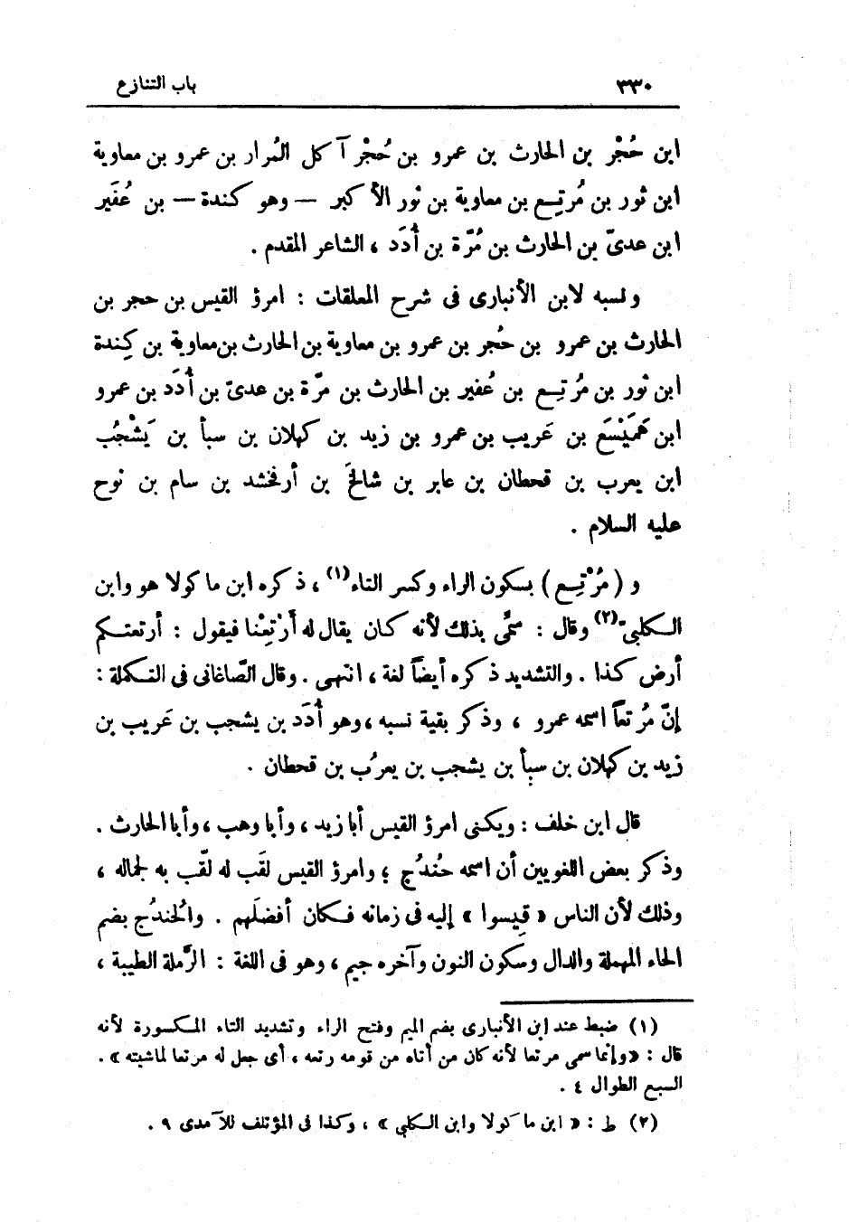 بن حجر بن الْحَارِث بن عَمْرو بن حجر آكل المرار بن عَمْرو بن مُعَاوِيَة بن ثَوْر بن مرتع ابْن مُعَاوِيَة بن ثَوْر الْأَكْبَر وَهُوَ كِنْدَة بن عفير بن عدي بن الْحَارِث بن مرّة ابْن أدد الشَّاعِر الْمُقدم وَنسبه لِابْنِ الْأَنْبَارِي فِي شرح المعلقات امْرُؤ الْقَيْس بن حجر بن الْحَارِث ابْن عَمْرو بن حجر بن عَمْرو بن مُعَاوِيَة بن الْحَارِث بن مُعَاوِيَة بن كِنْدَة بن ثَوْر بن مرتع بن عفير بن الْحَارِث بن مرّة بن عدي بن أدد بن عَمْرو بن هميسع بن عريب بن عَمْرو بن زيد بن كهلان بن سبأ بن يشجب بن يعرب بن قحطان بن عَابِر بن شالخ ابْن أرفخشد بن سَام بن نوح عَلَيْهِ السَّلَام ومرتع بِسُكُون الرَّاء وَكسر التَّاء ذكره ابْن مَاكُولَا وَابْن الْكَلْبِيّ وَقَالَ سمي بذلك لِأَنَّهُ كَانَ يُقَال لَهُ أرتعنا فَيَقُول أرتعتكم أَرض كَذَا وَالتَّشْدِيد ذكره أَيْضا لُغَة انْتهى وَقَالَ الصَّاغَانِي فِي التكملة إِن مرتعا اسْمه عَمْرو وَذكر بَقِيَّة نسبه وَهُوَ أدد بن يشجب بن عريب بن زيد بن كهلان بن سبأ بن يشجب بن يعرب بن قحطان