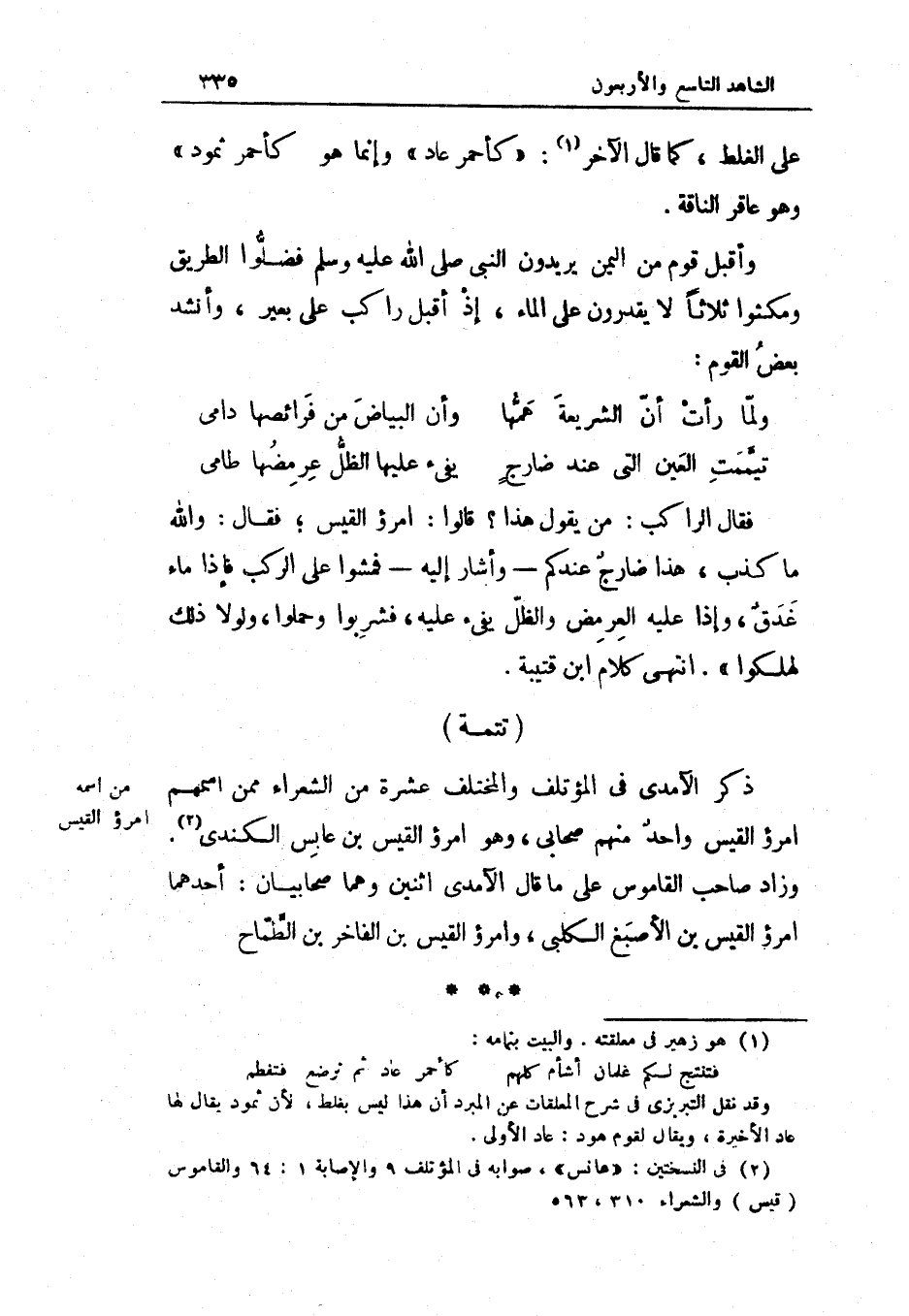 فَقَالَ الرَّاكِب من يَقُول هَذَا قَالُوا امْرُؤ الْقَيْس فَقَالَ وَالله مَا كذب هَذَا ضارج عنْدكُمْ وَأَشَارَ إِلَيْهِ فَمَشَوْا على الركب فَإِذا مَاء غدق وَإِذا عَلَيْهِ العرمض والظل يفِيء عَلَيْهِ فَشَرِبُوا وحملوا وَلَوْلَا ذَلِك لهلكوا انْتهى كَلَام ابْن قُتَيْبَة