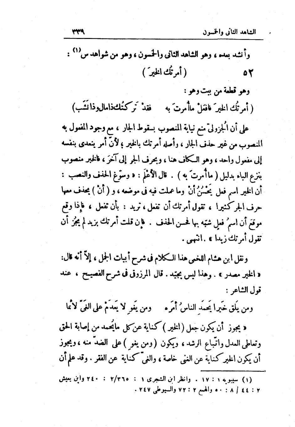 على أَن الْجُزُولِيّ منع نِيَابَة الْمَنْصُوب بِسُقُوط الْجَار مَعَ وجود الْمَفْعُول بِهِ الْمَنْصُوب من غير حذف الْجَار وَأَصله أَمرتك بِالْخَيرِ لِأَن أَمر يتَعَدَّى بِنَفسِهِ إِلَى مفعول وَاحِد وَهُوَ الْكَاف هُنَا وبحرف الْجَرّ إِلَى آخر ف الْخَيْر مَنْصُوب بِنَزْع الْبَاء بِدَلِيل مَا أمرت بِهِ قَالَ الأعلم وسوغ الْحَذف وَالنّصب أَن الْخَيْر اسْم فعل يحسن أَن وَمَا عملت فِيهِ فِي مَوْضِعه وَأَن يحذف مَعهَا حرف الْجَرّ كثيرا تَقول أَمرتك أَن تفعل تُرِيدُ بِأَن تفعل فَإِذا وَقع موقع أَن اسْم فعل شبه بهَا فَحسن الْحَذف فَإِن قلت أَمرتك بزيد لم يجز أَن تَقول أَمرتك زيدا انْتهى وَنقل ابْن هِشَام اللَّخْمِيّ هَذَا الْكَلَام فِي شرح أَبْيَات الْجمل إِلَّا أَنه قَالَ الْخَيْر مصدر وَهَذَا لَيْسَ بجيد قَالَ المرزوقي فِي شرح الفصيح عِنْد قَول الشَّاعِر (الطَّوِيل)