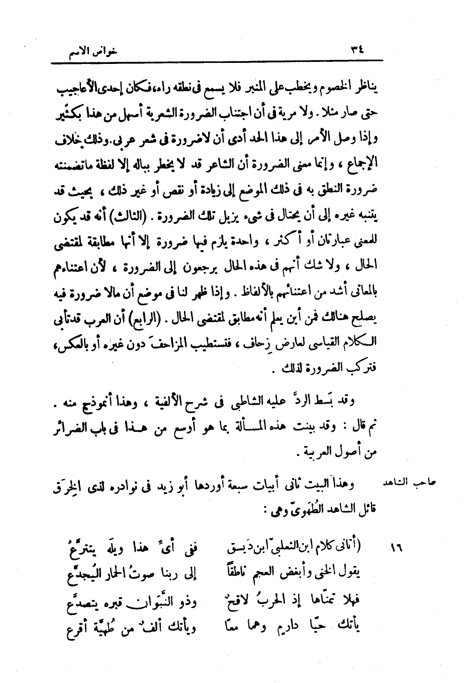 يناظر الْخُصُوم ويخطب على الْمِنْبَر فَلَا يسمع فِي نطقه رَاء فَكَانَ إِحْدَى الْأَعَاجِيب حَتَّى صَار مثلا وَلَا مرية فِي أَن اجْتِنَاب الضَّرُورَة الشعرية أسهل من هَذَا بِكَثِير وَإِذا وصل الْأَمر إِلَى هَذَا الْحَد أدّى أَن لَا ضَرُورَة فِي شعر عَرَبِيّ وَذَلِكَ خلاف الْإِجْمَاع وَإِنَّمَا معنى الضَّرُورَة أَن الشَّاعِر قد لَا يخْطر بِبَالِهِ إِلَّا لَفظه مَا تضمنته ضَرُورَة النُّطْق بِهِ فِي ذَلِك الْموضع إِلَى زِيَادَة أَو نقص أَو غير ذَلِك بِحَيْثُ قد ينتبه غَيره إِلَى أَن يحتال فِي شَيْء يزِيل تِلْكَ الضَّرُورَة الثَّالِث أَنه قد يكون للمعنى عبارتان أَو أَكثر وَاحِدَة يلْزم فِيهَا ضَرُورَة إِلَّا أَنَّهَا مُطَابقَة لمقْتَضى الْحَال وَلَا شكّ أَنهم فِي هَذِه الْحَال يرجعُونَ إِلَى الضَّرُورَة لِأَن اعتناءهم بالمعاني أَشد من اعتنائهم بالألفاظ وَإِذا ظهر لنا فِي مَوضِع أَن مَا لَا ضَرُورَة