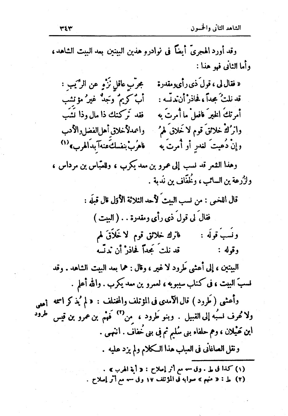 وَقَوله قد نلْت مجدا فحاذر أَن تدنسه الْبَيْتَيْنِ إِلَى أعشى طرود لَا غير وَقَالَ هما بعد الْبَيْت الشَّاهِد وَقد نسب الْبَيْت فِي كتاب سِيبَوَيْهٍ لعَمْرو بن معد يكرب وَالله أعلم وأعشى طرود قَالَ الْآمِدِيّ فِي المؤتلف والمختلف لم يذكر اسْمه وَلَا عرف نسبه إِلَى الْقَبِيل وَبَنُو طرود من فهم بن عَمْرو بن قيس بن عيلان وهم حلفاء بني سليم ثمَّ فِي بني خفاف انْتهى وَنقل الصَّاغَانِي فِي الْعباب هَذَا الْكَلَام وَلم يزدْ عَلَيْهِ