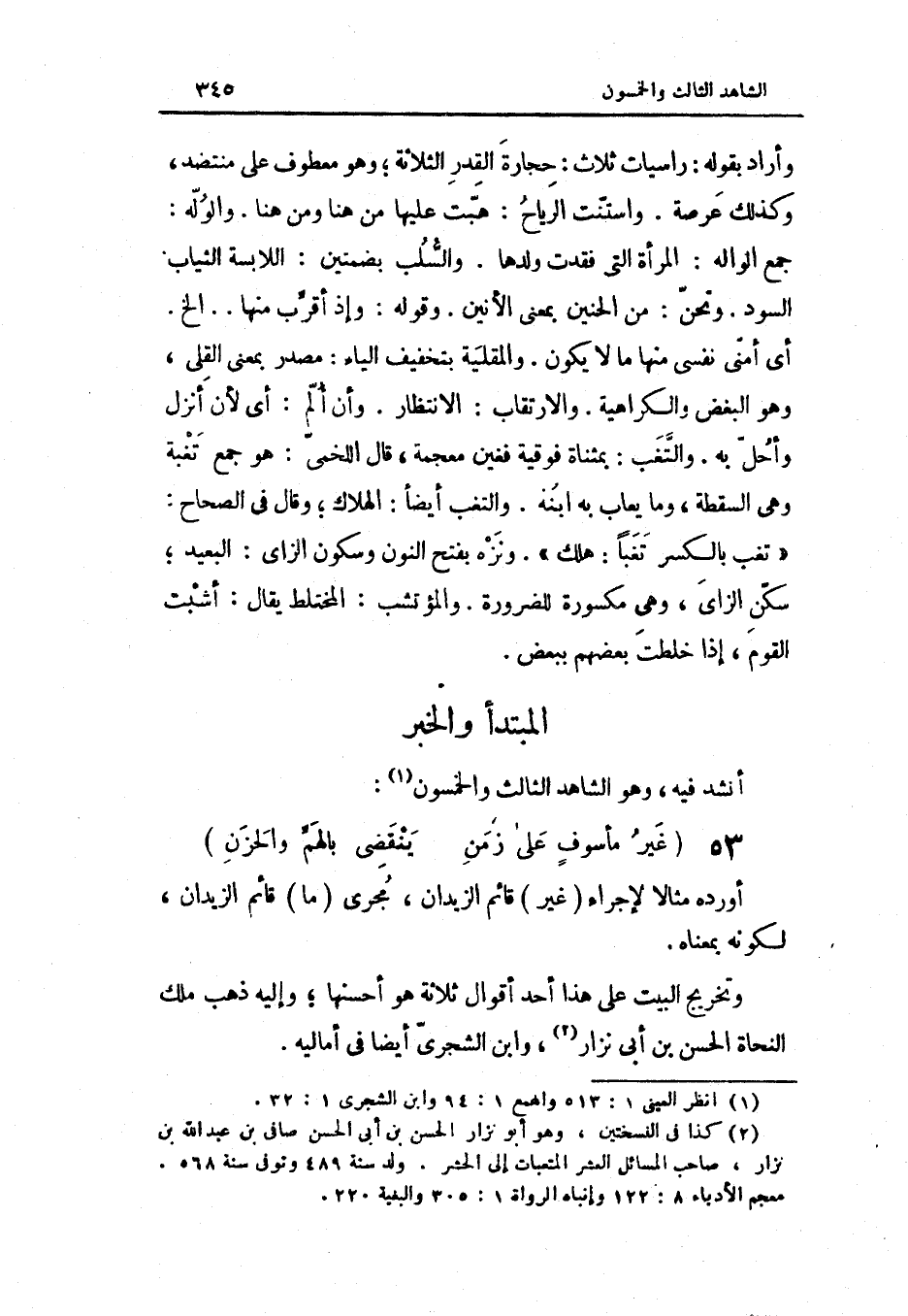 أوردهُ مِثَالا لإجراء غير قَائِم الزيدان مجْرى مَا قَائِم الزيدان لكَونه بِمَعْنَاهُ \ وَتَخْرِيج الْبَيْت على هَذَا أحد أَقْوَال ثَلَاثَة هُوَ أحْسنهَا وَإِلَيْهِ ذهب ملك النُّحَاة الْحسن بن أبي نزار وَابْن الشجري أَيْضا فِي أمالية