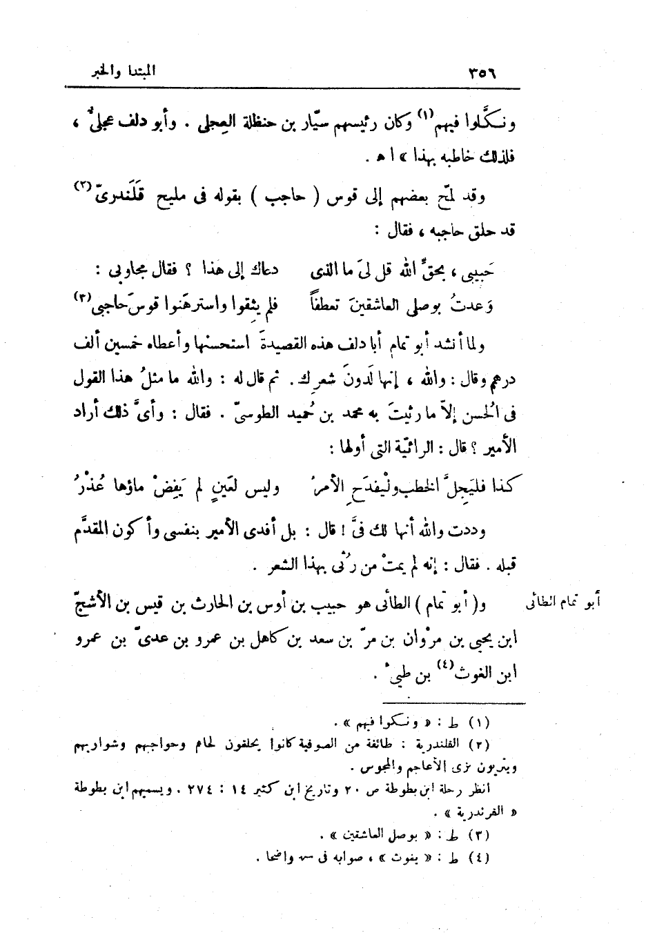 وددت وَالله أَنَّهَا لَك فِي قَالَ بل أفدي الْأَمِير بنفسي وأكون الْمُقدم قبله فَقَالَ إِنَّه لم يمت من رثي بِهَذَا الشّعْر وأَبُو تَمام الطَّائِي هُوَ حبيب بن أَوْس بن الْحَارِث بن قيس بن الْأَشَج بن يحيى ابْن مَرْوَان بن مر بن سعد بن كَاهِل بن عَمْرو بن عدي بن عَمْرو بن الْغَوْث بن طَيئ