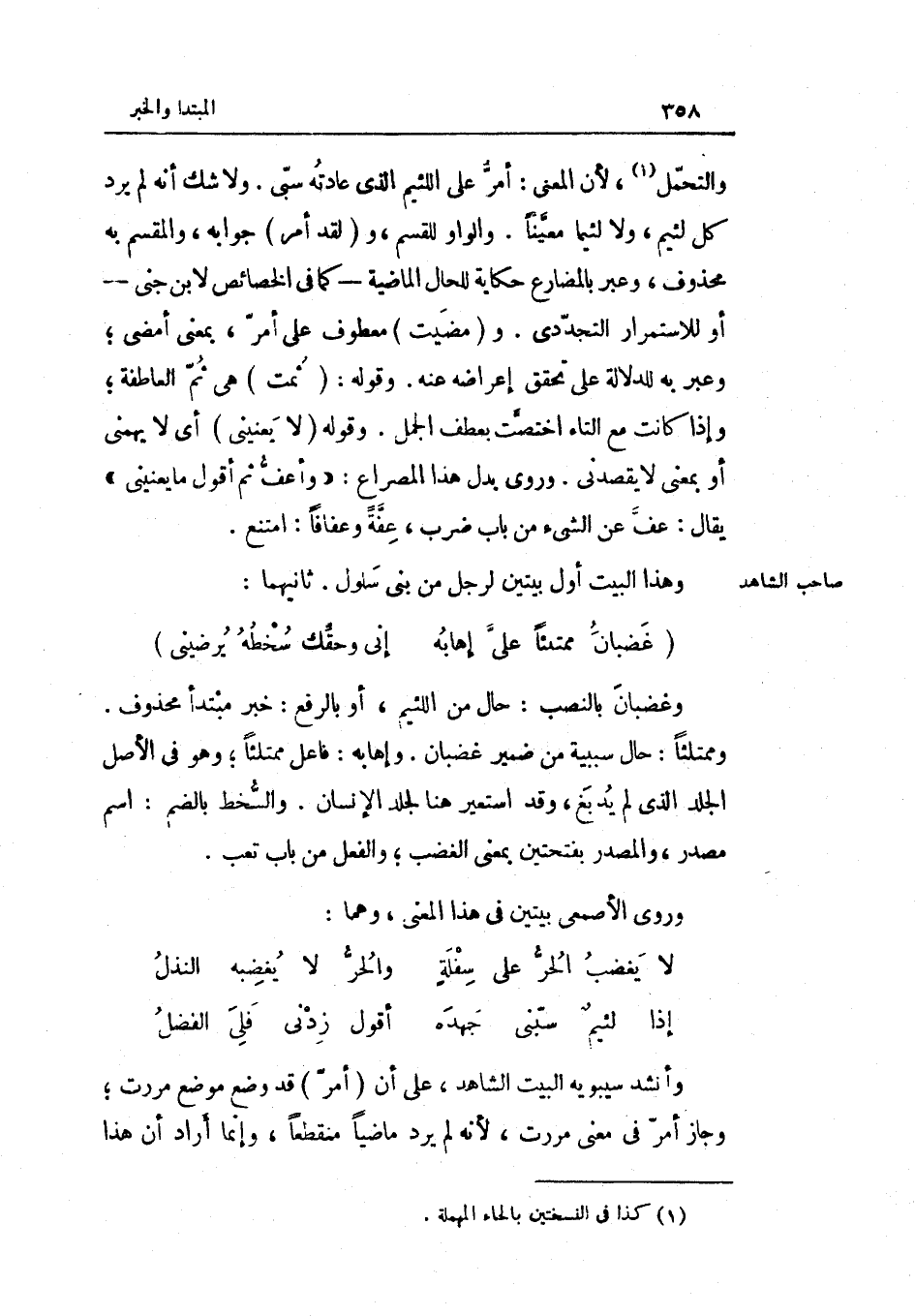 وغضبان بِالنّصب حَال من اللَّئِيم أَو بِالرَّفْع خبر مُبْتَدأ مَحْذُوف ومتلئا حَال سَبَبِيَّة من ضمير غَضْبَان وإهابه فَاعل ممتلئا وَهُوَ فِي الأَصْل الْجلد الَّذِي لم يدبغ وَقد استعير هُنَا لجلد الْإِنْسَان والسخط بِالضَّمِّ اسْم مصدر والمصدر بِفتْحَتَيْنِ بِمَعْنى الْغَضَب وَالْفِعْل من بَاب تَعب وروى الْأَصْمَعِي بَيْتَيْنِ فِي هَذَا الْمَعْنى وهما (السَّرِيع)