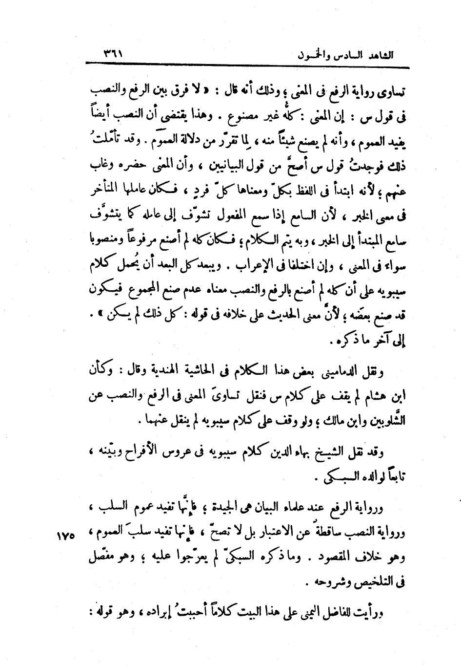 وَقد نقل الشَّيْخ بهاء الدَّين كَلَام سِيبَوَيْهٍ فِي عروس الأفراح وَبَينه تَابعا لوالده السُّبْكِيّ وَرِوَايَة الرّفْع عِنْد عُلَمَاء الْبَيَان هِيَ الجيدة فَإِنَّهَا تفِيد عُمُوم السَّلب وَرِوَايَة النصب سَاقِطَة عَن الِاعْتِبَار بل لَا تصح فَإِنَّهَا تفِيد سلب الْعُمُوم وَهُوَ خلاف الْمَقْصُود وَمَا ذكره السُّبْكِيّ لم يعرجوا عَلَيْهِ وَهُوَ مفصل فِي التَّلْخِيص وشروحه وَرَأَيْت للفاضل اليمني على هَذَا الْبَيْت كلَاما أَحْبَبْت إِيرَاده وَهُوَ قَوْله