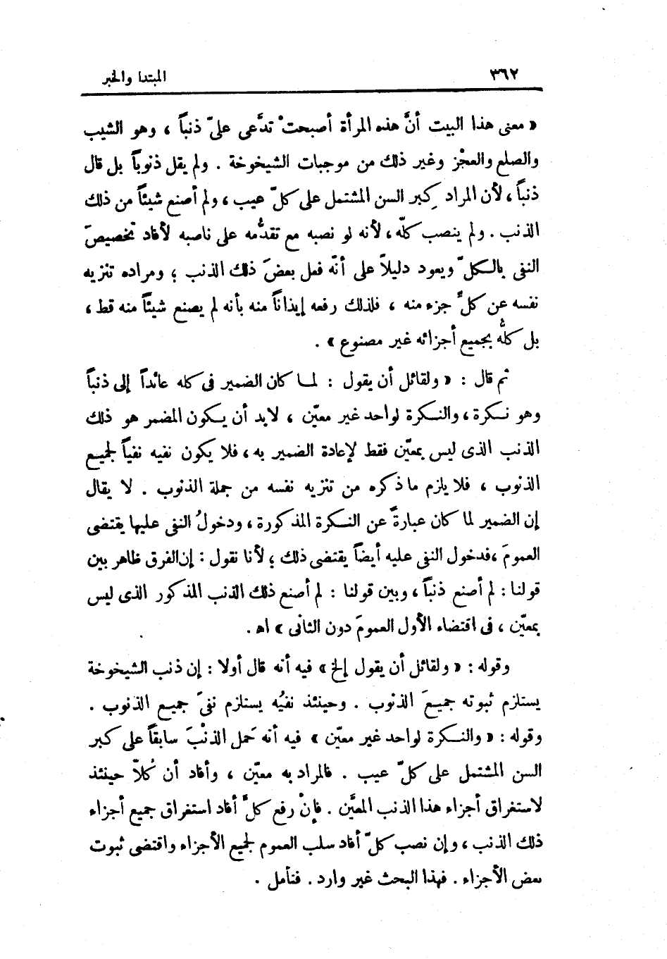 وَقَوله وَلقَائِل أَن يَقُول إِلَخ فِيهِ إِنَّه قَالَ أَولا إِن قَالَ أَولا إِن ذَنْب الشيخوخة يسْتَلْزم ثُبُوته جَمِيع الذُّنُوب وَحِينَئِذٍ نَفْيه يسْتَلْزم نفي جَمِيع الذُّنُوب وَقَوله والنكرة لوَاحِد غير معِين فِيهِ أَنه حمل الذَّنب \ سَابِقًا على كبر السن الْمُشْتَمل على كل عيب فَالْمُرَاد بِهِ معِين وَأفَاد أَن كلا حِينَئِذٍ لاستغراق أَجزَاء هَذَا الذِّئْب الْمعِين فَإِن رفع كل أَفَادَ استغراق جَمِيع أَجزَاء ذَلِك الذَّنب وَإِن نصب كل أَفَادَ سلب الْعُمُوم لجَمِيع الْأَجْزَاء وَاقْتضى ثُبُوت بعض الْأَجْزَاء فَهَذَا الْبَحْث غير وَارِد فَتَأمل