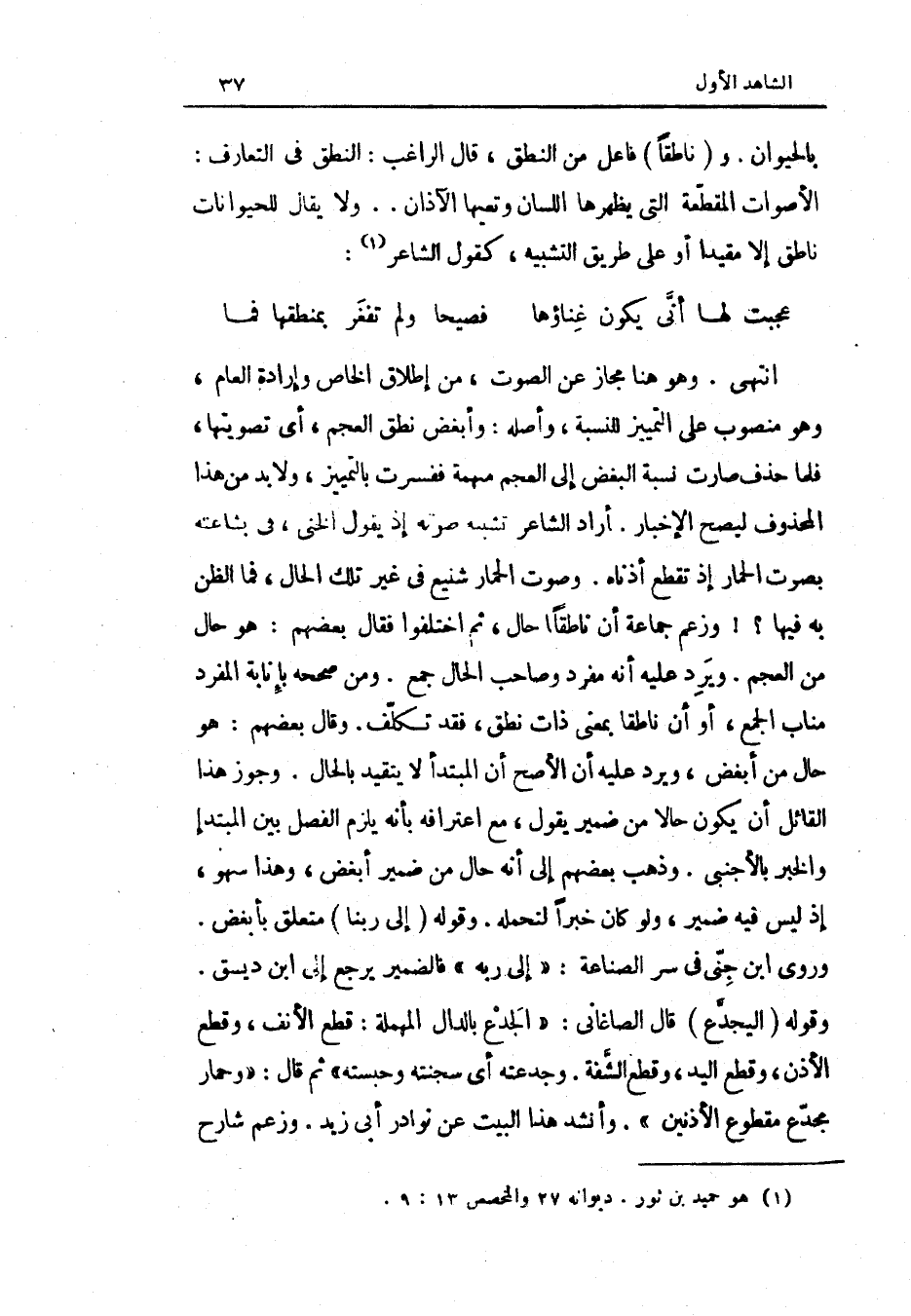 انْتهى وَهُوَ هُنَا مجَاز عَن الصَّوْت من إِطْلَاق الْخَاص وَإِرَادَة الْعَام وَهُوَ مَنْصُوب على التَّمْيِيز للنسبة وَأَصله وَأبْغض نطق الْعَجم أَي تصويتها فَلَمَّا حذف صَارَت نِسْبَة البغض إِلَى الْعَجم مُبْهمَة ففسرت بالتمييز ولابد من هَذَا الْمَحْذُوف ليَصِح الْإِخْبَار أَرَادَ الشَّاعِر تَشْبِيه صَوته إِذْ يَقُول الخنى فِي بشاعته بِصَوْت الْحمار إِذْ تقطع أذنَاهُ وَصَوت الْحمار شنيع فِي غير تِلْكَ الْحَال فَمَا الظَّن بِهِ فِيهَا وَزعم جمَاعَة أَن ناطقا حَال ثمَّ اخْتلفُوا فَقَالَ بَعضهم هُوَ حَال من الْعَجم وَيرد عَلَيْهِ أَنه مفرج وَصَاحب الْحَال جمع وَمن صَححهُ بإنابة الْمُفْرد مناب الْجمع أَو أَن ناطقا بِمَعْنى ذَات نطق فقد تكلّف وَقَالَ بَعضهم هُوَ حَال من أبْغض وَيرد عَلَيْهِ أَن الْأَصَح أَن الْمُبْتَدَأ لَا يتَقَيَّد بِالْحَال وَجوز هَذَا الْقَائِل أَن يكون حَالا من ضمير يَقُول مَعَ أعترافه بِأَنَّهُ يلْزم الْفَصْل بَين الْمُبْتَدَأ وَالْخَبَر بالأجنبي وَذهب بَعضهم إِلَى أَنه حَال من ضمير أبْغض وَهَذَا سَهْو إِذْ لَيْسَ فِيهِ ضمير وَلَو كَانَ خَبرا لتحمله وَقَوله إِلَى رَبنَا مُتَعَلق بأبغض وروى ابْن جني فِي سر الصِّنَاعَة إِلَى ربه فَالضَّمِير يرجع إِلَى ابْن ديسق وَقَوله اليجدع قَالَ الصَّاغَانِي الجدع بِالدَّال الْمُهْملَة قطع الْأنف وَقطع الْأذن وَقطع الْيَد وَقطع الشّفة وجدعته أَي سجنته وحبسته ثمَّ قَالَ وحمار مجدع مَقْطُوع الْأُذُنَيْنِ وَأنْشد هَذَا الْبَيْت عَن نَوَادِر أبي زيد وَزعم شَارِح