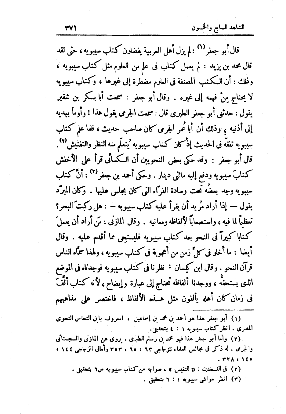 قَالَ أَبُو جَعْفَر لم يزل أهل الْعَرَبيَّة يفضلون كتاب سِيبَوَيْهٍ حَتَّى لقد قَالَ مُحَمَّد بن يزِيد لم يعْمل كتاب فِي علم من الْعُلُوم مثل كتاب سِيبَوَيْهٍ وَذَلِكَ أَن الْكتب المصنفة فِي الْعُلُوم مضطرة إِلَى غَيرهَا وَكتاب سِيبَوَيْهٍ لَا يحْتَاج من فهمه إِلَى غَيره وَقَالَ أَبُو جَعْفَر سَمِعت أَبَا بكر بن شقير يَقُول حَدثنِي أَبُو جَعْفَر الطَّبَرِيّ قَالَ سَمِعت الْجرْمِي يَقُول هَذَا وَأَوْمَأَ بيدَيْهِ إِلَى أذنية وَذَلِكَ أَن أَبَا عمر الْجرْمِي كَانَ صَاحب حَدِيث فَلَمَّا علم كتاب سِيبَوَيْهٍ تفقه فِي الحَدِيث إِذْ كَانَ كتاب سِيبَوَيْهٍ يتَعَلَّم مِنْهُ النّظر والتفتيش قَالَ أَبُو جَعْفَر وَقد حكى بعض النَّحْوِيين أَن الْكسَائي قَرَأَ على الْأَخْفَش كتاب سِيبَوَيْهٍ وَدفع إِلَيْهِ مِائَتي دِينَار وَحكى أَحْمد بن جَعْفَر أَن كتاب سِيبَوَيْهٍ وجد بعضه تَحت وسَادَة الْفراء الَّتِي كَانَ يجلس عَلَيْهَا وَكَانَ الْمبرد يَقُول إِذا أَرَادَ مُرِيد أَن يقْرَأ عَلَيْهِ كتاب سِيبَوَيْهٍ هَل ركبت الْبَحْر تَعْظِيمًا لما فِيهِ واستصعابا لألفاظه ومعانيه وَقَالَ الْمَازِني من أَرَادَ أَن يعْمل كتابا كَبِيرا فِي النَّحْو بعد كتاب سِيبَوَيْهٍ فليستحي مِمَّا أقدم عَلَيْهِ وَقَالَ أَيْضا مَا أَخْلو فِي كل زمن من أعجوبة فِي كتاب