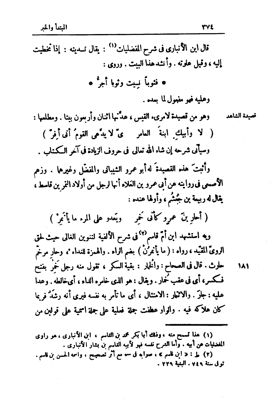 وَسَيَأْتِي شَرحه إِن شَاءَ الله تَعَالَى فِي حُرُوف الزِّيَادَة فِي آخر الْكتاب وَأثبت هَذِه القصيدة لَهُ أَبُو عَمْرو الشَّيْبَانِيّ والمفضل وَغَيرهمَا وَزعم الْأَصْمَعِي فِي رِوَايَته عَن أبي عَمْرو بن الْعَلَاء أَنَّهَا لرجل من أَوْلَاد النمر بن قاسط يُقَال لَهُ ربيعَة ابْن جعْشم وأولها عِنْده
