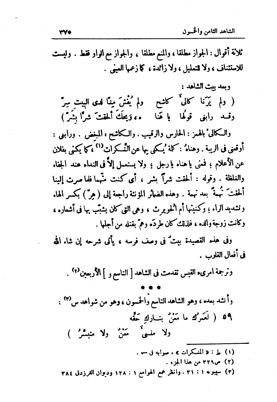 والكالئ بِالْهَمْز الحارس والرقيب والكاشح الْمُبْغض ورابني أوقعني فِي الرِّيبَة وهناه كلمة يكنى بهَا عَن النكرات كَمَا يكنى بفلان عَن الْأَعْلَام فَمَعْنَى يَا هَناه يَا رجل وَلَا يسْتَعْمل إِلَّا فِي النداء عِنْد الْجفَاء والغلظة وَقَوله ألحقت شرا بشر أَي كنت مُتَّهمًا فَلَمَّا صرت إِلَيْنَا ألحقت تُهْمَة بعد تُهْمَة وَهَذِه الضمائر المؤنثة رَاجِعَة إِلَى هر بِكَسْر الْهَاء وَتَشْديد الرَّاء وكنيتها أم الْحُوَيْرِث وَهِي الَّتِي كَانَ يشبب بهَا فِي أشعاره وَكَانَت زوجه وَالِده فَلذَلِك كَانَ طرده وهم بقتْله من أجلهَا وَفِي هَذِه القصيدة بَيت فِي وصف فرسه يَأْتِي شَرحه إِن شَاءَ الله فِي أَفعَال الْقُلُوب وترجمة امْرِئ الْقَيْس تقدّمت فِي الشَّاهِد التَّاسِع وَالْأَرْبَعِينَ وَأنْشد بعده وَهُوَ الشَّاهِد التَّاسِع وَالْخَمْسُونَ وَهُوَ من شَوَاهِد س (الطَّوِيل)