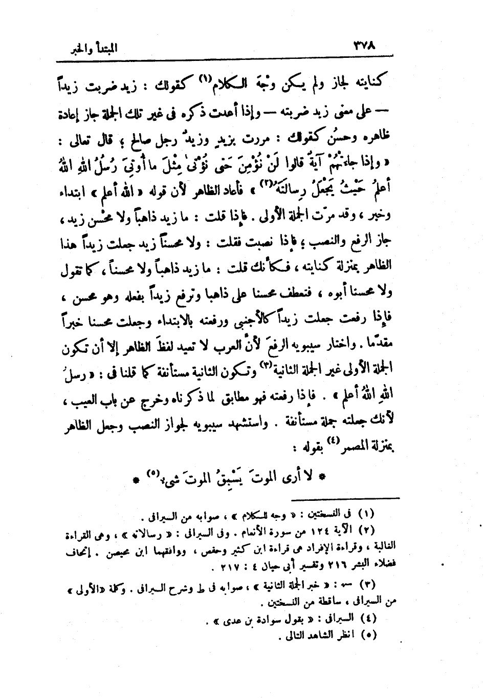 فَأَعَادَ الْإِظْهَار وَذَلِكَ أَن قَوْله لَا أرى الْمَوْت يسْبق الْمَوْت شَيْء الْمَوْت الأول هُوَ الْمَفْعُول الأول لأرى ويسبق الْمَوْت شَيْء فِي مَوضِع الْمَفْعُول الثَّانِي وهما فِي جملَة وَاحِدَة وَكَانَ يَنْبَغِي أَن يَقُول يسْبقهُ شَيْء فيضمره وَاسْتشْهدَ لاختيار الرّفْع فِيمَا اخْتَارَهُ فِيهِ بقول الفرزدق