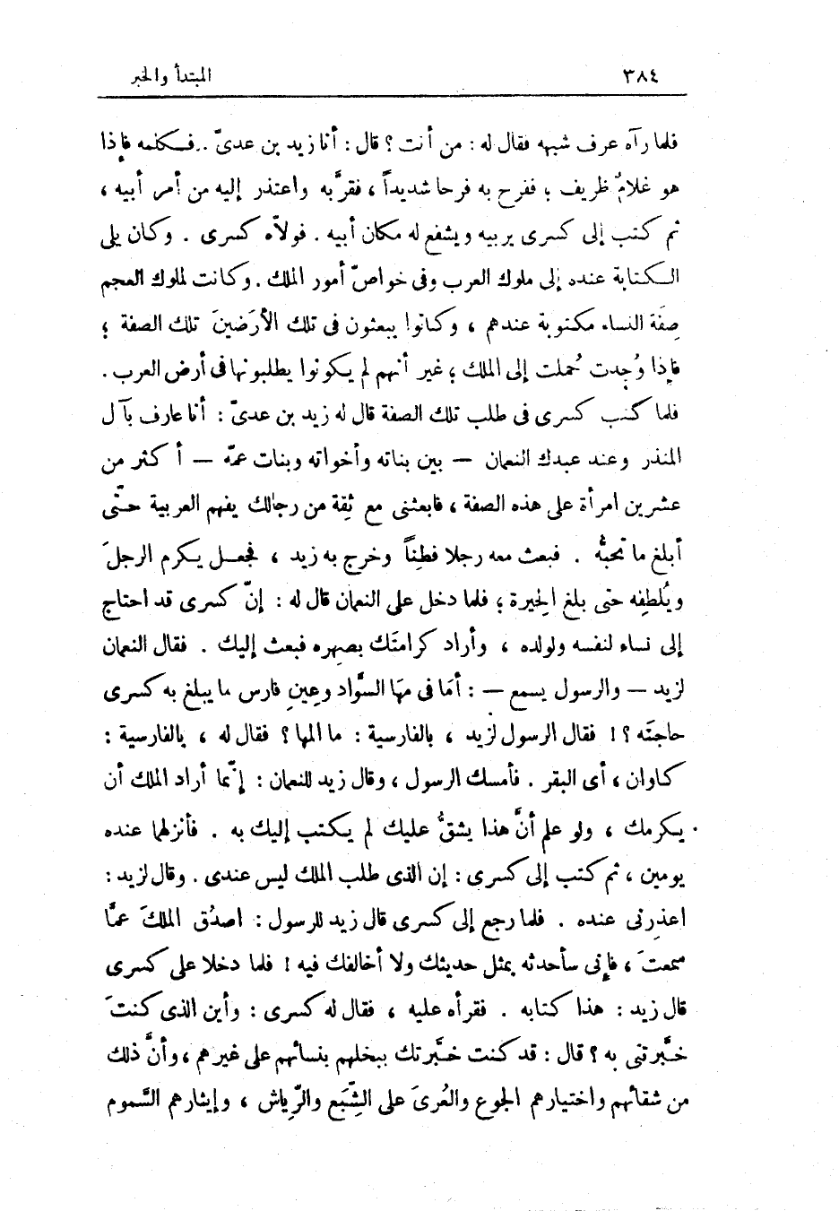 فَلَمَّا كتب كسْرَى فِي طلب تِلْكَ الصّفة قَالَ لَهُ زيد بن عدي أَنا عَارِف بآل الْمُنْذر وَعند عَبدك النُّعْمَان بَين بَنَاته وأخواته وَبَنَات عَمه أَكثر من عشْرين امْرَأَة على هَذِه الصّفة فابعثني مَعَ ثِقَة من رجالك يفهم الْعَرَبيَّة حَتَّى أبلغ مَا تحبه فَبعث مَعَه رجلا فطنا وَخرج بِهِ زيد فَجعل يكرم الرجل ويلطفه حَتَّى بلغ الْحيرَة فَلَمَّا دخل على النُّعْمَان قَالَ لَهُ إِن كسْرَى قد احْتَاجَ إِلَى نسَاء لنَفسِهِ ولولده واراد كرامتك بصهره فَبعث إِلَيْك فَقَالَ النُّعْمَان لزيد وَالرَّسُول يسمع أما فِي مها السوَاد وَعين فَارس مَا يبلغ بِهِ كسْرَى حَاجته فَقَالَ الرَّسُول لزيد بِالْفَارِسِيَّةِ مَا المها فَقَالَ لَهُ بِالْفَارِسِيَّةِ كاوان أَي الْبَقر فَأمْسك الرَّسُول وَقَالَ زيد للنعمان إِنَّمَا أَرَادَ الْملك أَن يكرمك وَلَو علم أَن هَذَا يشق عَلَيْك لم يكْتب إِلَيْك بِهِ فأنزلهما عِنْده يَوْمَيْنِ ثمَّ كتب إِلَى كسْرَى إِن الَّذِي طلب الْملك لَيْسَ عِنْدِي وَقَالَ لزيد اعذرني عِنْده فَلَمَّا رَجَعَ إِلَى كسْرَى قَالَ زيد للرسول أصدق الْملك عَمَّا سَمِعت فَإِنِّي سأحدثه بِمثل حَدِيثك وَلَا أخالفك فِيهِ فَلَمَّا دخلا على كسْرَى قَالَ زيد هَذَا كِتَابه فقرأه عَلَيْهِ فَقَالَ لَهُ كسْرَى وَأَيْنَ الَّذِي كنت خبرتني بِهِ قَالَ قد كنت خبرتك ببخلهم بنسائهم على غَيرهم وَأَن ذَلِك من شقائهم واختيارهم الْجُوع والعري على الشِّبَع والرياش وإيثارهم السمُوم