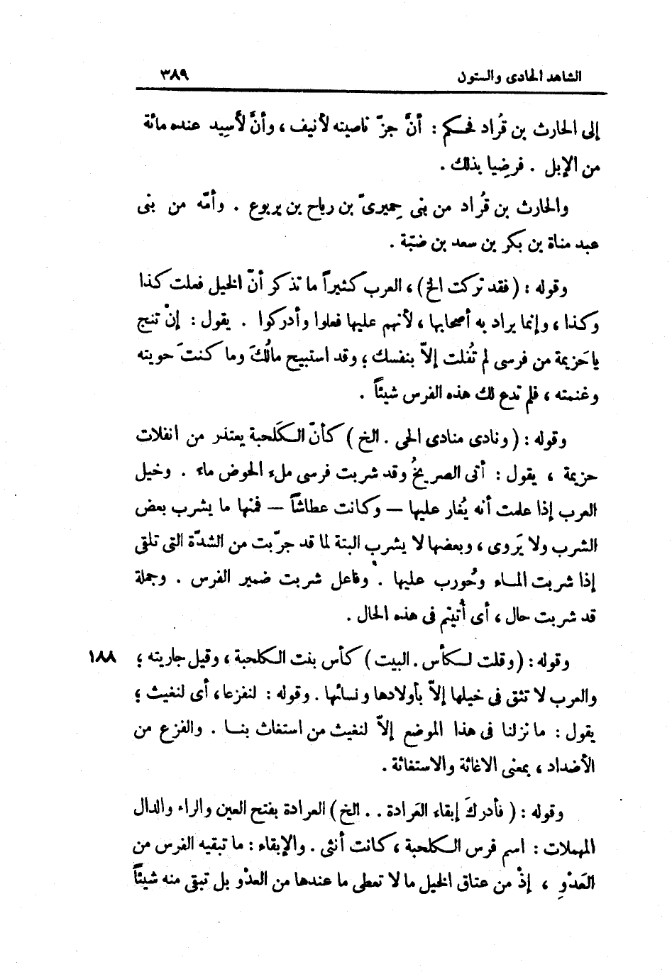 أَن جز ناصيته لأنيف وَأَن لأسيد عِنْده مائَة من الْإِبِل فرضيا بذلك والْحَارث بن قراد من بني حميري بن ريَاح بن يَرْبُوع وَأمه من بني عبد مَنَاة بن بكر بن سعد بن ضبة وَقَوله فقد تركت إِلَخ الْعَرَب كثيرا مَا تذكر أَن الْخَيل فعلت كَذَا وَكَذَا وَإِنَّمَا يُرَاد بِهِ أَصْحَابهَا لأَنهم عَلَيْهَا فعلوا وأدركوا يَقُول إِن تنج يَا حزيمة من فرسي لم تفلت إِلَّا بِنَفْسِك وَقد استبيح مَالك وَمَا كنت حويته وغنمته فَلم تدع لَك هَذِه الْفرس شَيْئا وَقَوله ونادى مُنَادِي الْحَيّ إِلَخ كَأَن الكلحبة يعْتَذر من انفلات حزيمة يَقُول أُتِي الصَّرِيخ وَقد شربت فرسي ملْء الْحَوْض مَاء وخيل الْعَرَب إِذا علمت أَنه يغار عَلَيْهَا وَكَانَت عطاشا فَمِنْهَا مَا يشرب بعض الشّرْب وَلَا يرْوى وَبَعضهَا لَا يشرب الْبَتَّةَ لما قد جربت من الشدَّة الَّتِي تلقي إِذا شربت المَاء وحورب عَلَيْهَا وفاعل شربت ضمير الْفرس وَجُمْلَة قد شربت حَال أَي أتيتم فِي هَذِه الْحَال وَقَوله وَقلت لكأس الْبَيْت كأس بنت الكلحبة وَقيل جَارِيَته وَالْعرب لَا تثق فِي خيلها إِلَّا بِأَوْلَادِهَا ونسائها وَقَوله لنفزعا أَي لنغيث يَقُول مَا نزلنَا فِي هَذَا الْموضع إِلَّا لنغيث من اسْتَغَاثَ بِنَا والفزع من الأضداد بِمَعْنى الإغاثة والاستغاثة وَقَوله فَأدْرك إبْقَاء العرادة إِلَخ العرادة بِفَتْح الْعين وَالرَّاء وَالدَّال المهملات اسْم فرس الكلحبة كَانَت أُنْثَى والإبقاء مَا تبقية الْفرس من الْعَدو إِذْ من عتاق الْخَيل مَا لَا تُعْطِي مَا عِنْدهَا من الْعَدو بل تبقي مِنْهُ شَيْئا