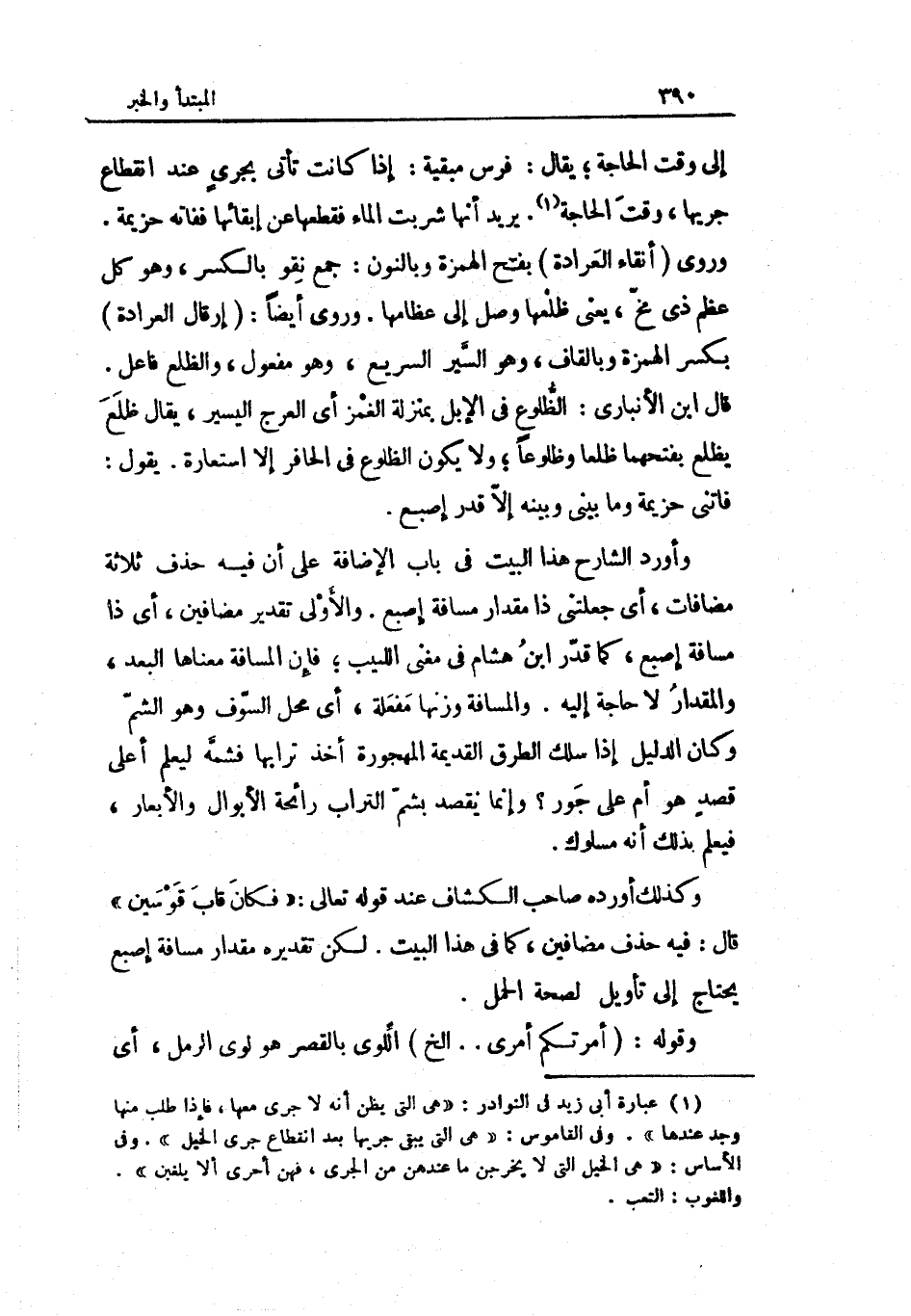 وروى أنقاء العرادة بِفَتْح الْهمزَة وبالنون جمع نقو بِالْكَسْرِ وَهُوَ كل عظم ذِي مخ يَعْنِي ظلعها وصل إِلَى عظامها وروى أَيْضا إرقال العرادة بِكَسْر الْهمزَة وبالقاف وَهُوَ السّير السَّرِيع وَهُوَ مفعول والظلع فَاعل قَالَ ابْن الْأَنْبَارِي الظلوع فِي الْإِبِل بِمَنْزِلَة الغمز أَي العرج الْيَسِير يُقَال ظلع يظلع بفتحهما ظلعا وظلوعا وَلَا يكون الظلوع فِي الْحَافِر إِلَّا اسْتِعَارَة يَقُول فَاتَنِي حزيمة وَمَا بيني وَبَينه إِلَّا قدر إِصْبَع وَأورد الشَّارِح هَذَا الْبَيْت فِي بَاب الْإِضَافَة على أَن فِيهِ حذف ثَلَاثَة مضافات أَي جَعَلتني ذَا مِقْدَار مَسَافَة إِصْبَع وَالْأولَى تَقْدِير مضافين أَي ذَا مَسَافَة إِصْبَع كَمَا قدر ابْن هِشَام فِي مغنى اللبيب فَإِن الْمسَافَة مَعْنَاهَا الْبعد والمقدار لَا حَاجَة إِلَيْهِ والمسافة وَزنهَا مفعلة أَي مَحل السوف وَهُوَ الشم وَكَانَ الدَّلِيل إِذا سلك الطّرق الْقَدِيمَة المهجورة أَخذ ترابها فشمه ليعلم أَعلَى قصد هُوَ أم على جور وَإِنَّمَا يقْصد بشم التُّرَاب رَائِحَة الأبوال والأبعار فَيعلم بذلك أَنه مسلوك وَكَذَلِكَ أوردهُ صَاحب الْكَشَّاف عِنْد قَوْله تَعَالَى {فَكَانَ قاب قوسين} قَالَ فِيهِ حذف مضافين كَمَا فِي هَذَا الْبَيْت لَكِن تَقْدِيره مِقْدَار مَسَافَة إِصْبَع يحْتَاج إِلَى تَأْوِيل لصِحَّة الْحمل وَقَوله أَمرتكُم أَمْرِي إِلَخ اللوى بِالْقصرِ هُوَ لوى الرمل أَي