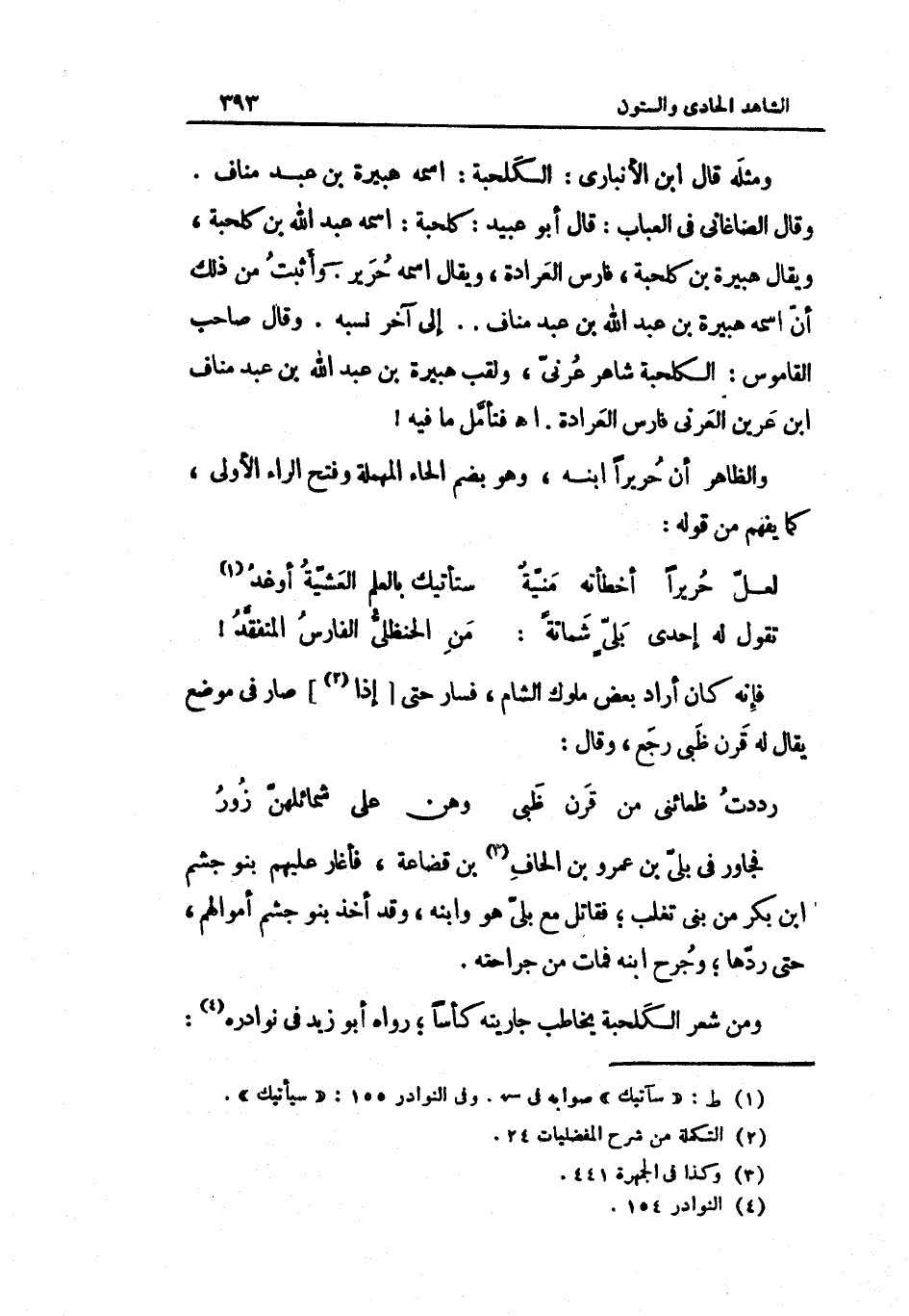 وَمثله قَالَ ابْن الْأَنْبَارِي الكلحبة اسْمه هُبَيْرَة بن عبد منَاف وَقَالَ الصَّاغَانِي فِي الْعباب قَالَ أَبُو عبيد كلحبة اسْمه عبد الله بن كلحبة وَيُقَال هُبَيْرَة بن كلحبة فَارس العرادة وَيُقَال اسْمه حَرِير وَأثبت من ذَلِك أَن اسْمه هُبَيْرَة بن عبد الله بن عبد منَاف إِلَى آخر نسبه وَقَالَ صَاحب الْقَامُوس الكلحبة شَاعِر عرني ولقب هُبَيْرَة بن عبد الله بن عبد منَاف بن عرين العرني فَارس العرادة ذ هـ. فَتَأمل مَا فِيهِ وَالظَّاهِر أَن حَرِيرًا ابْنه وَهُوَ بِضَم الْحَاء الْمُهْملَة وَفتح الرَّاء الأولى كَمَا يفهم من قَوْله (الطَّوِيل)