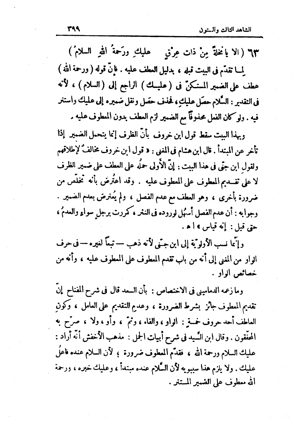 لما تقدم فِي الْبَيْت قبله بِدَلِيل الْعَطف عَلَيْهِ فَإِن قَوْله وَرَحْمَة الله عطف على الضَّمِير المستكن فِي عَلَيْك الرَّاجِع إِلَى السَّلَام لِأَنَّهُ فِي التَّقْدِير السَّلَام حصل عَلَيْك فَحذف حصل وَنقل ضَمِيره إِلَى عَلَيْك واستتر فِيهِ وَلَو كَانَ الْفِعْل محذوفا مَعَ الضَّمِير لزم الْعَطف بِدُونِ الْمَعْطُوف عَلَيْهِ وَبِهَذَا الْبَيْت سقط قَول ابْن خروف بِأَن الظّرْف إِنَّمَا يتَحَمَّل الضَّمِير إِذا تَأَخّر عَن الْمُبْتَدَأ قَالَ ابْن هِشَام فِي الْمُغنِي قَول ابْن خروف مُخَالف لإطلاقهم وَلقَوْل ابْن جني فِي هَذَا الْبَيْت إِن الأولى حمله على الْعَطف على ضمير الظّرْف لَا على تَقْدِيم الْمَعْطُوف على الْمَعْطُوف عَلَيْهِ قد اعْترض بِأَنَّهُ تخلص من ضَرُورَة بِأُخْرَى وَهُوَ الْعَطف مَعَ عدم الْفَصْل وَلم يعْتَرض بِعَدَمِ الضَّمِير وَجَوَابه أَن عدم الْفَصْل أسهل لوروده فِي النثر كمررت بِرَجُل سَوَاء والعدم حَتَّى قيل إِنَّه قِيَاس 1. وَإِنَّمَا نسب الْأَوْلَوِيَّة إِلَى ابْن جني لِأَنَّهُ ذهب تبعا لغيره فِي حرف الْوَاو من الْمُغنِي إِلَى أَنه من بَاب تقدم الْمَعْطُوف على الْمَعْطُوف عَلَيْهِ وَأَنه من خَصَائِص الْوَاو وَمَا زَعمه الدماميني فِي الِاخْتِصَاص بِأَن السعد قَالَ فِي شرح الْمِفْتَاح إِن تَقْدِيم الْمَعْطُوف جَائِز بِشَرْط الضَّرُورَة وَعدم التَّقْدِيم على الْعَامِل وَكَون العاطف أحد حُرُوف خَمْسَة الْوَاو وَالْفَاء وَثمّ وأو وَلَا صرح بِهِ الْمُحَقِّقُونَ وَقَالَ ابْن السَّيِّد فِي شرح أَبْيَات الْجمل مَذْهَب الْأَخْفَش أَنه أَرَادَ عَلَيْك السَّلَام ورَحِمَهُ اللَّهُ فَقدم الْمَعْطُوف ضَرُورَة لِأَن السَّلَام عِنْده فَاعل عَلَيْك وَلَا يلْزم هَذَا سِيبَوَيْهٍ لِأَن السَّلَام عِنْده مُبْتَدأ وَعَلَيْك خَبره ورَحِمَهُ اللَّهُ مَعْطُوف على الضَّمِير المستر