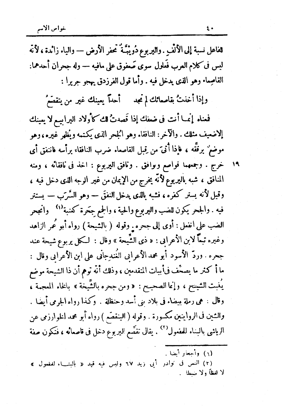 للْفَاعِل نِسْبَة إِلَى الْألف واليربوع دويبة تحفر الأَرْض وَالْيَاء زَائِدَة لِأَنَّهُ لَيْسَ فِي كَلَام الْعَرَب فعلول سوى صعفوق على مَا فِيهِ وَله جحران أَحدهمَا القاصعاء وَهُوَ الَّذِي يدْخل فِيهِ وَأما قَول الفرزدق يهجو جَرِيرًا (الْكَامِل)