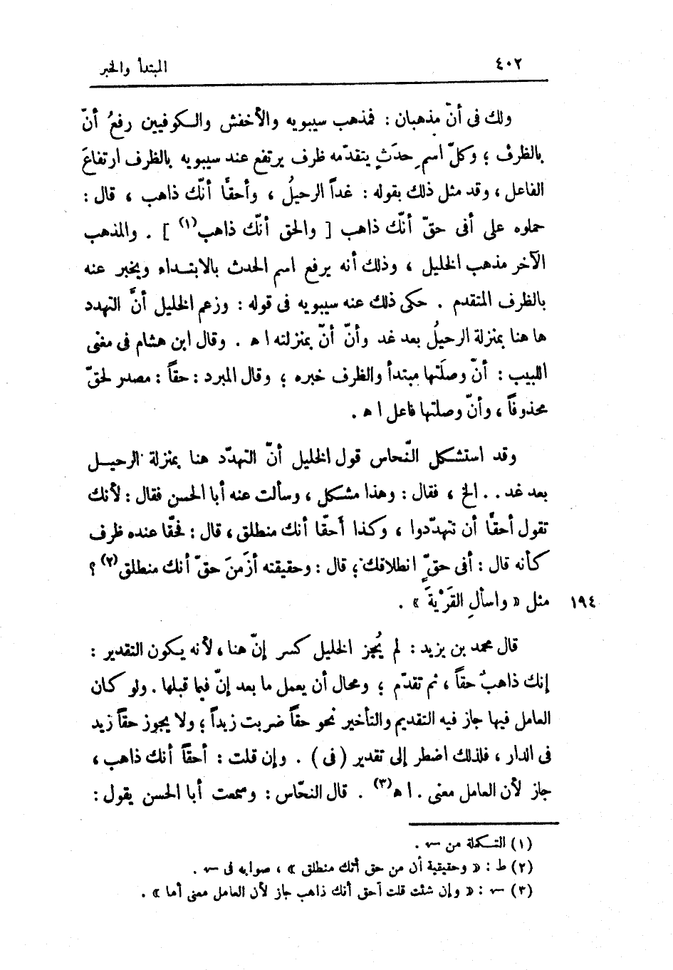 وَقد اسْتشْكل النّحاس قَول الْخَلِيل أَن التهدد هُنَا بِمَنْزِلَة الرحيل بعد غَد إِلَخ فَقَالَ وَهَذَا مُشكل وسالت عَنهُ أَبَا الْحسن فَقَالَ لِأَنَّك تَقول أحقا أَن تتهددوا وَكَذَا أحقا أَنَّك منطلق قَالَ فحقا عِنْده ظرف كَأَنَّهُ قَالَ أَفِي حق انطلاقك قَالَ وَحَقِيقَته أزمن حق أَنَّك منطلق مثل وأسأل الْقرْيَة قَالَ مُحَمَّد بن يزِيد لم يجز الْخَلِيل كسر إِن هُنَا لِأَنَّهُ يكون التَّقْدِير إِنَّك ذَاهِب حَقًا ثمَّ تقدم ومحال أَن يعْمل مَا بعد إِن فِيمَا قبلهَا وَلَو كَانَ الْعَامِل فِيهَا جَازَ فِيهِ التَّقْدِيم وَالتَّأْخِير نَحْو حَقًا ضربت زيدا وَلَا يجوز حَقًا زيد فِي الدَّار فَلذَلِك اضْطر إِلَى تَقْدِير فِي وَإِن قلت أحقا أَنَّك ذَاهِب جَازَ لِأَن الْعَامِل معنى ا. هـ.