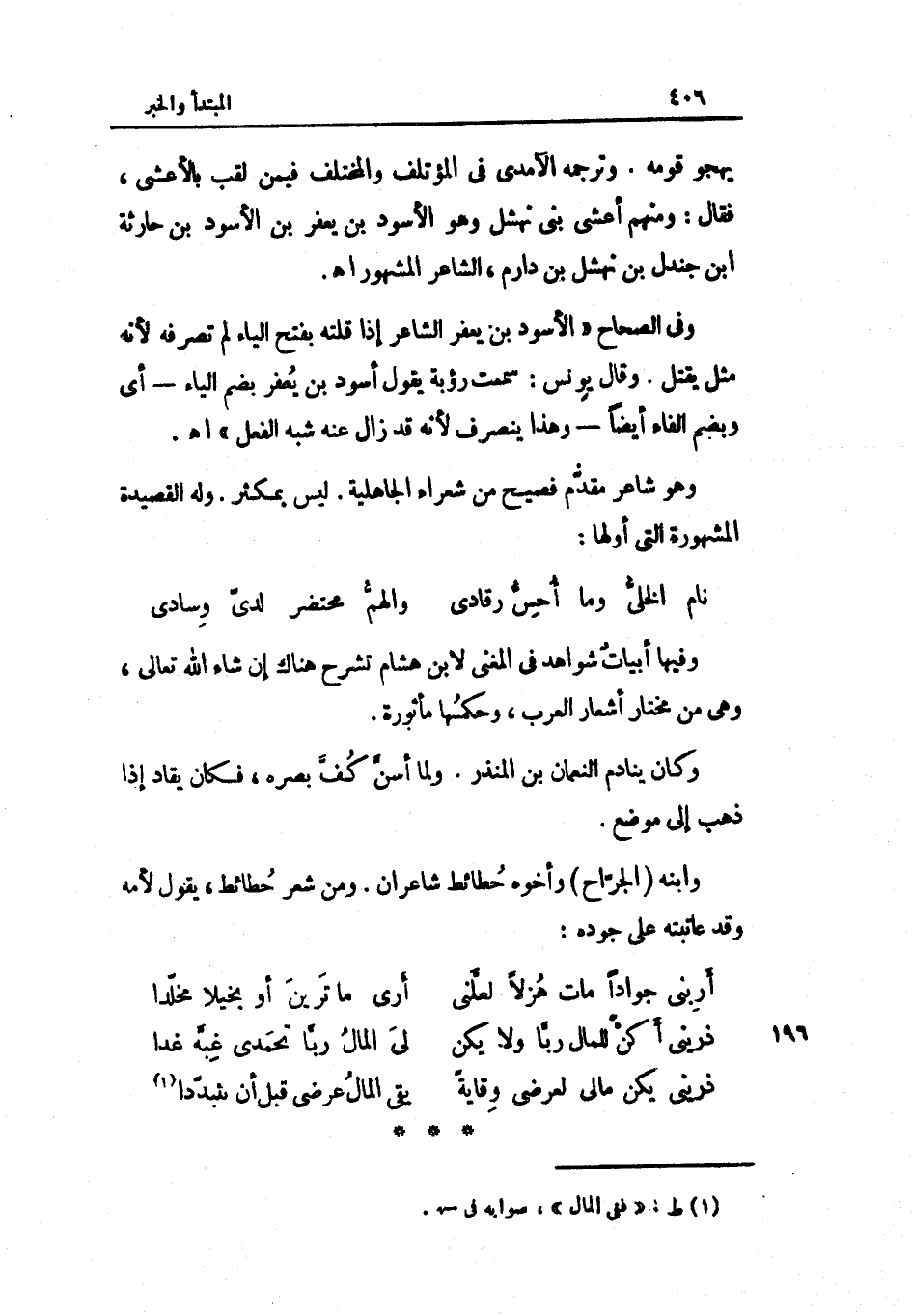 وفيهَا أَبْيَات شَوَاهِد فِي الْمُغنِي لِأَبْنِ هِشَام تشرح هُنَاكَ إِن شَاءَ الله تَعَالَى وَهِي من مُخْتَار أشعار الْعَرَب وَحكمهَا مأثورة وَكَانَ ينادم النُّعْمَان بن الْمُنْذر وَلما أسن كف بَصَره فَكَانَ يُقَاد إِذا ذهب إِلَى مَوضِع وَابْنه الْجراح وَأَخُوهُ حطائط شاعران وَمن شعر حطائط يَقُول لأمه وَقد عاتبته على جوده (الطَّوِيل)