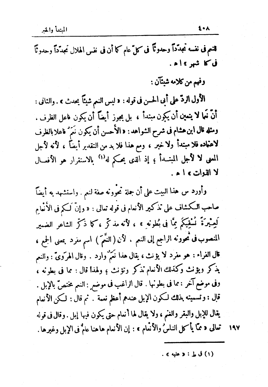وَأورد س هَذَا الْبَيْت على أَن جملَة تحوونه صفة لنعم وَاسْتشْهدَ بِهِ أَيْضا صَاحب الْكَشَّاف على تذكير الْأَنْعَام فِي قَوْله تَعَالَى (وَإِن لكم فِي الْأَنْعَام لعبرة نسقيكم مِمَّا فِي بطونه لِأَنَّهُ مُذَكّر كَمَا ذكر الشَّاعِر الضَّمِير الْمَنْصُوب فِي تحوونه الرَّاجِع إِلَى النعم لِأَنَّهُ النعم اسْم مُفْرد بِمَعْنى الْجمع قَالَ الْفراء هُوَ مُفْرد لَا يؤنث يُقَال هَذَا نعم وَارِد وَقَالَ الْهَرَوِيّ وَالنعَم يذكر وَيُؤَنث وَكَذَلِكَ الْأَنْعَام تذكر وتؤنث وَلِهَذَا قَالَ مِمَّا فِي بطونه وَفِي مَوضِع آخر مِمَّا فِي بطونها قَالَ الرَّاغِب فِي مَوضِع النعم مُخْتَصّ بِالْإِبِلِ قَالَ وتسميته بذلك لكَون الْإِبِل عِنْدهم أعظم نعْمَة ثمَّ قَالَ لَكِن الْأَنْعَام يُقَال لِلْإِبِلِ وَالْبَقر وَالْغنم وَلَا يُقَال لَهَا أنعام حَتَّى يكون فِيهَا إبل وَقَالَ فِي قَوْله تَعَالَى (مِمَّا يَأْكُل النَّاس والأنعام) إِن الْأَنْعَام هَا هُنَا عَام فِي الْإِبِل وَغَيرهَا