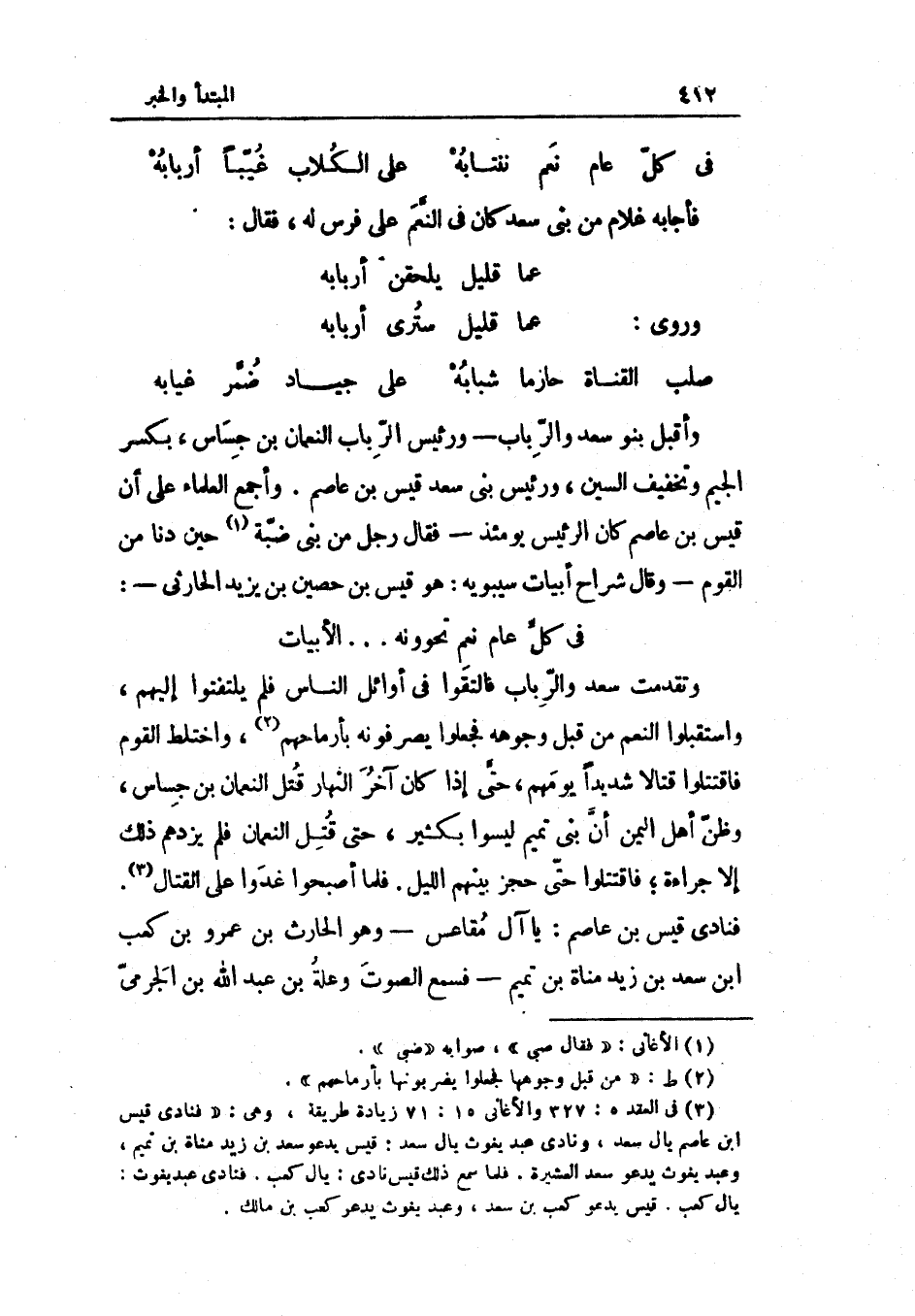 (فِي كل عَام نعم ننتابه ... على الْكلاب غيبا أربابه فَأَجَابَهُ غُلَام من بني سعد كَانَ فِي النعم على فرس لَهُ فَقَالَ)