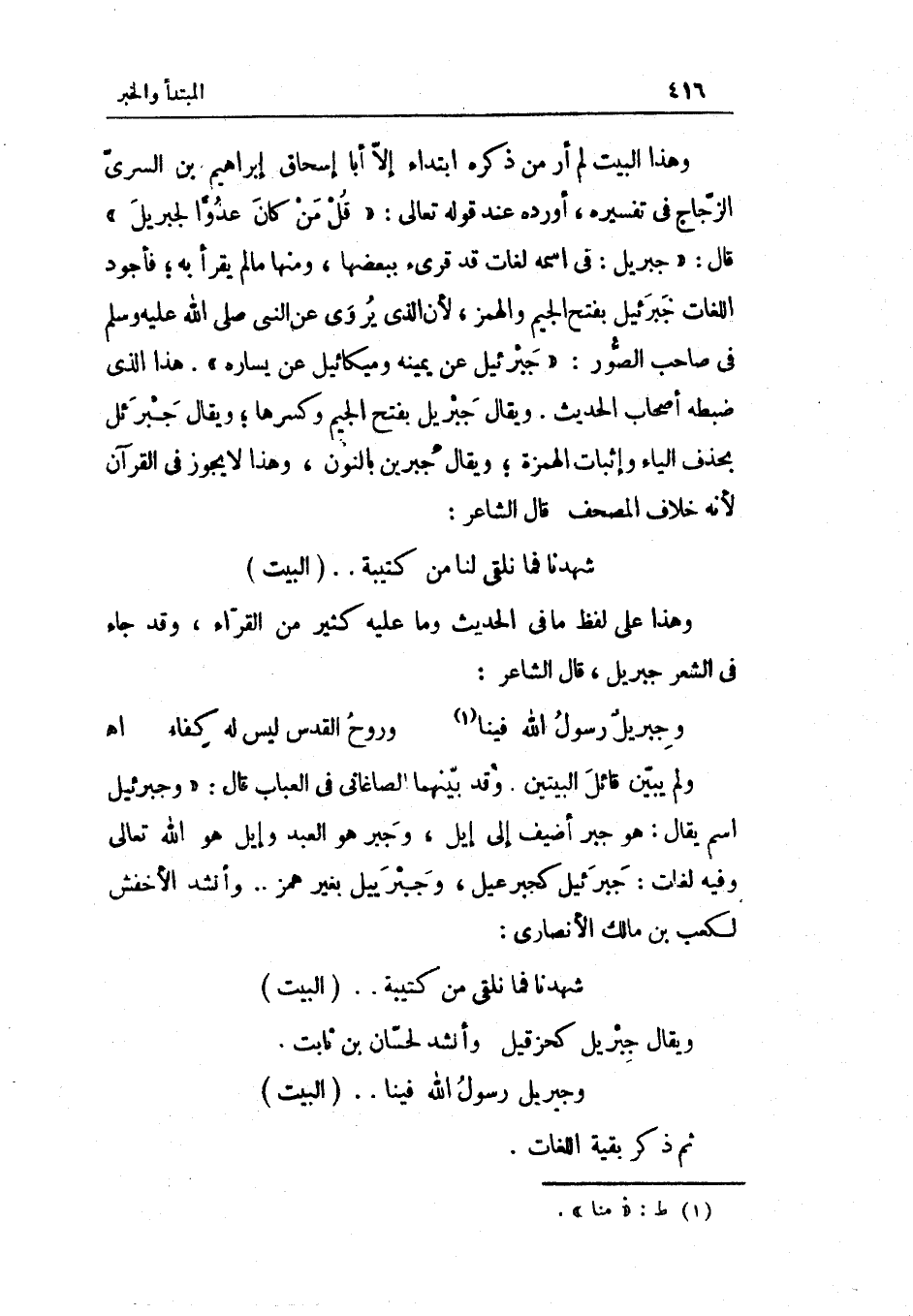 وَهَذَا على لفظ مَا فِي الحَدِيث وَمَا عَلَيْهِ كثير من الْقُرَّاء وَقد جَاءَ فِي شعر جِبْرِيل قَالَ الشَّاعِر الوافر