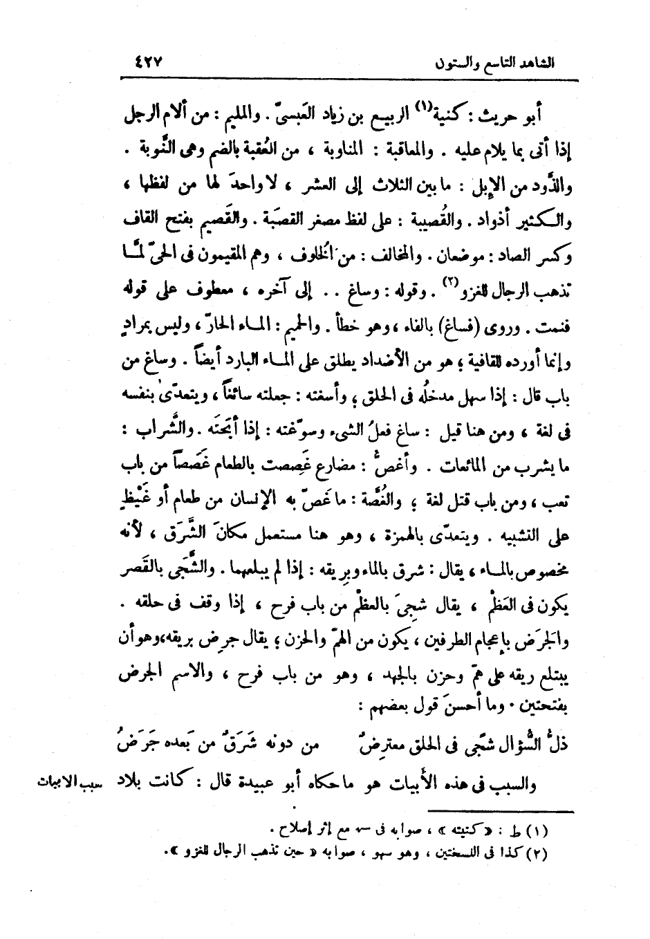 للغزو وَقَوله وساغ إِلَى آخِره مَعْطُوف على قَوْله فَنمت وروى فساغ بِالْفَاءِ وَهُوَ خطأ وَالْحَمِيم المَاء الْحَار وَلَيْسَ بِمُرَاد وَإِنَّمَا أوردهُ للقافية هُوَ من الأضداد يُطلق على المَاء الْبَارِد أَيْضا وساغ من بَاب قَالَ إِذا سهل مدخله فِي الْحلق وأسغته جعلته سائغا وَيَتَعَدَّى بِنَفسِهِ فِي لُغَة وَمن هُنَا قيل سَاغَ فعل الشَّيْء وسوغته إِذا أبحته وَالشرَاب مَا يشرب من الْمَائِعَات وأغص مضارع غصصت بِالطَّعَامِ غصصا من بَاب تَعب وَمن بَاب قتل لُغَة والغصة مَا غص بِهِ الْإِنْسَان من طَعَام أَو غيظ على التَّشْبِيه وَيَتَعَدَّى بِالْهَمْزَةِ وَهُوَ هُنَا مُسْتَعْمل مَكَان الشرق لِأَنَّهُ مَخْصُوص بِالْمَاءِ يُقَال شَرق بِالْمَاءِ وبريقة إِذا لم يبلعهما والشجى بِالْقصرِ يكون فِي الْعظم يُقَال شجى بالعظم من بَاب فَرح إِذا وقف فِي حلقه والجرض بإعجام الطَّرفَيْنِ يكون من ألهم والحزن يُقَال جرض بريقه وَهُوَ أَن يبتلع رِيقه على هم وحزن بالجهد وَهُوَ من بَاب فَرح وَالِاسْم الجرض بِفتْحَتَيْنِ وَمَا أحسن قَول بَعضهم (الْبَسِيط)