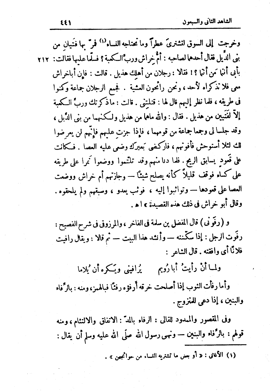 وَخرجت إِلَى السُّوق لتشتري عطرا وَمَا تحتاجه النِّسَاء فَمر بهَا فتيَان من بني الديل فَقَالَ أَحدهمَا لصَاحبه أم خرَاش وَرب الْكَعْبَة فسلما عَلَيْهَا فَقَالَت بِأبي أَنْتُمَا من أَنْتُمَا فَقَالَا رجلَانِ من أهلك هُذَيْل قَالَت فَإِن أَبَا خرَاش معي فَلَا تذكراه لأحد وَنحن رائحون العشية فَجمع الرّجلَانِ جمَاعَة وكمنوا فِي طَريقَة فَلَمَّا نظر إِلَيْهِم قَالَ لَهَا قتلتني قَالَت مَا ذكرتك وَرب الْكَعْبَة إِلَّا لفتيين من هُذَيْل فَقَالَ وَالله مَا هما من هُذَيْل ولكنهما من بني الديل وَقد جلسا لي وجمعا جمَاعَة من قومهما فَإِذا جزت عَلَيْهِم فَإِنَّهُم لن يعرضُوا لَك لِئَلَّا أستوحش فأفوتهم فاركضي بعيرك وضعي عَلَيْهِ الْعَصَا فَكَانَت على قعُود يسابق الرّيح فَلَمَّا دنا مِنْهُم وَقد تلثموا وَوَضَعُوا تَمرا على طَريقَة على كسَاء فَوقف قَلِيلا كَأَنَّهُ يصلح شَيْئا وجازتهم أم خرَاش وَوضعت الْعَصَا على قعودها وتوثبوا إِلَيْهِ فَوَثَبَ يعدو وسبقهم وَلم يلحقوه وَقَالَ أَبُو خرَاش فِي ذَلِك هَذِه القصيدة ا. هـ.