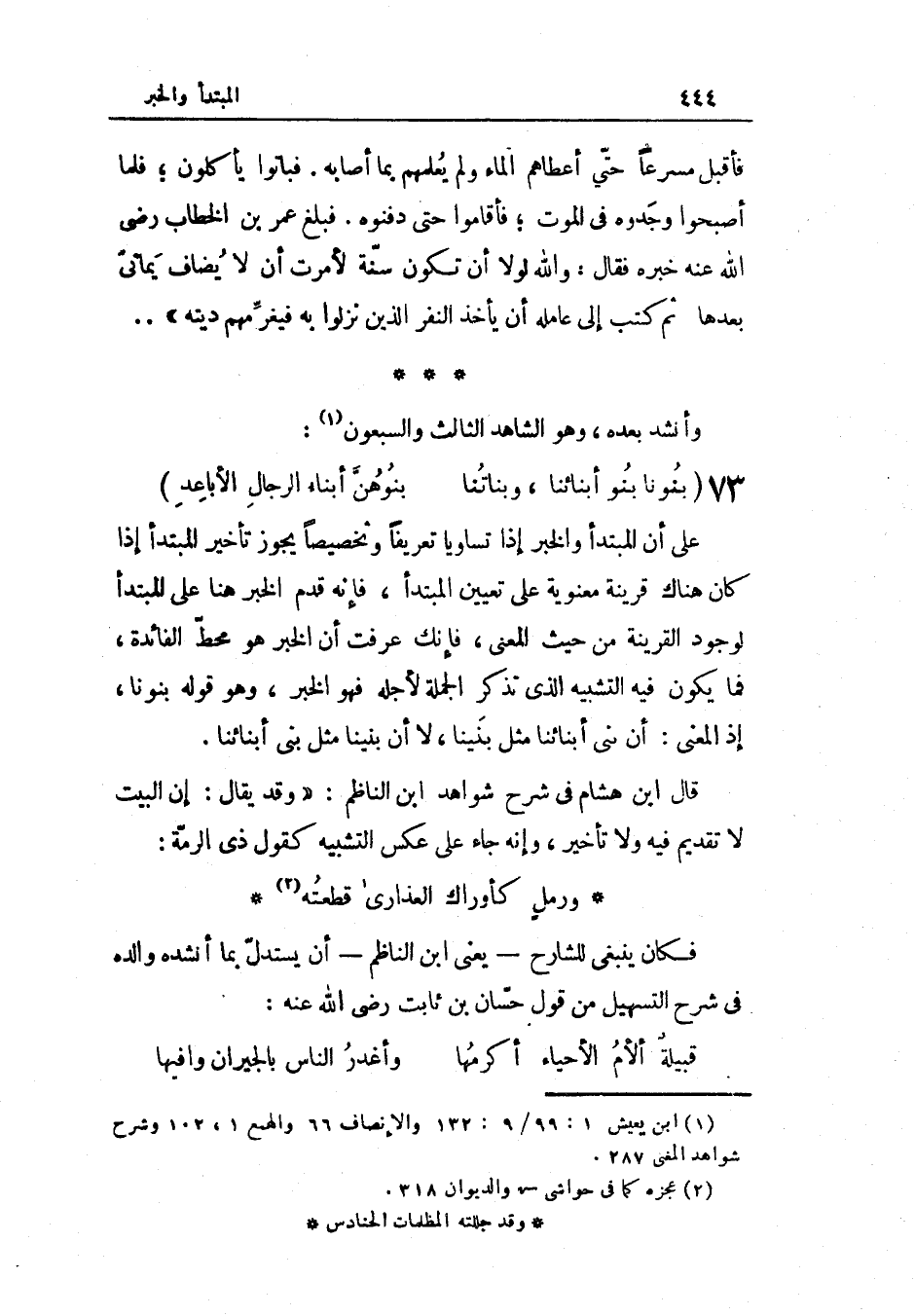 على أَن الْمُبْتَدَأ وَالْخَبَر إِذا تَسَاويا تعريفا وتخصيصا يجوز تَأْخِير الْمُبْتَدَأ إِذا كَانَ هُنَاكَ قرينَة معنوية على تعْيين الْمُبْتَدَأ فَإِنَّهُ قدم الْخَبَر هُنَا على الْمُبْتَدَأ لوُجُود الْقَرِينَة من حَيْثُ الْمَعْنى فَإنَّك عرفت أَن الْخَبَر هُوَ محط الْفَائِدَة فَمَا يكون فِيهِ التَّشْبِيه الَّذِي تذكر الْجُمْلَة لأَجله فَهُوَ الْخَبَر وَهُوَ قَوْله بنونا إِذْ الْمَعْنى أَن بني أَبْنَائِنَا مثل بنينَا لَا أَن بنينَا مثل بني أَبْنَائِنَا قَالَ ابْن هِشَام فِي شرح شَوَاهِد ابْن النَّاظِم وَقد يُقَال إِن هَذَا الْبَيْت لَا تَقْدِيم فِيهِ وَلَا تَأْخِير وَإنَّهُ جَاءَ على عكس التَّشْبِيه كَقَوْل ذِي الرمة (الطَّوِيل)