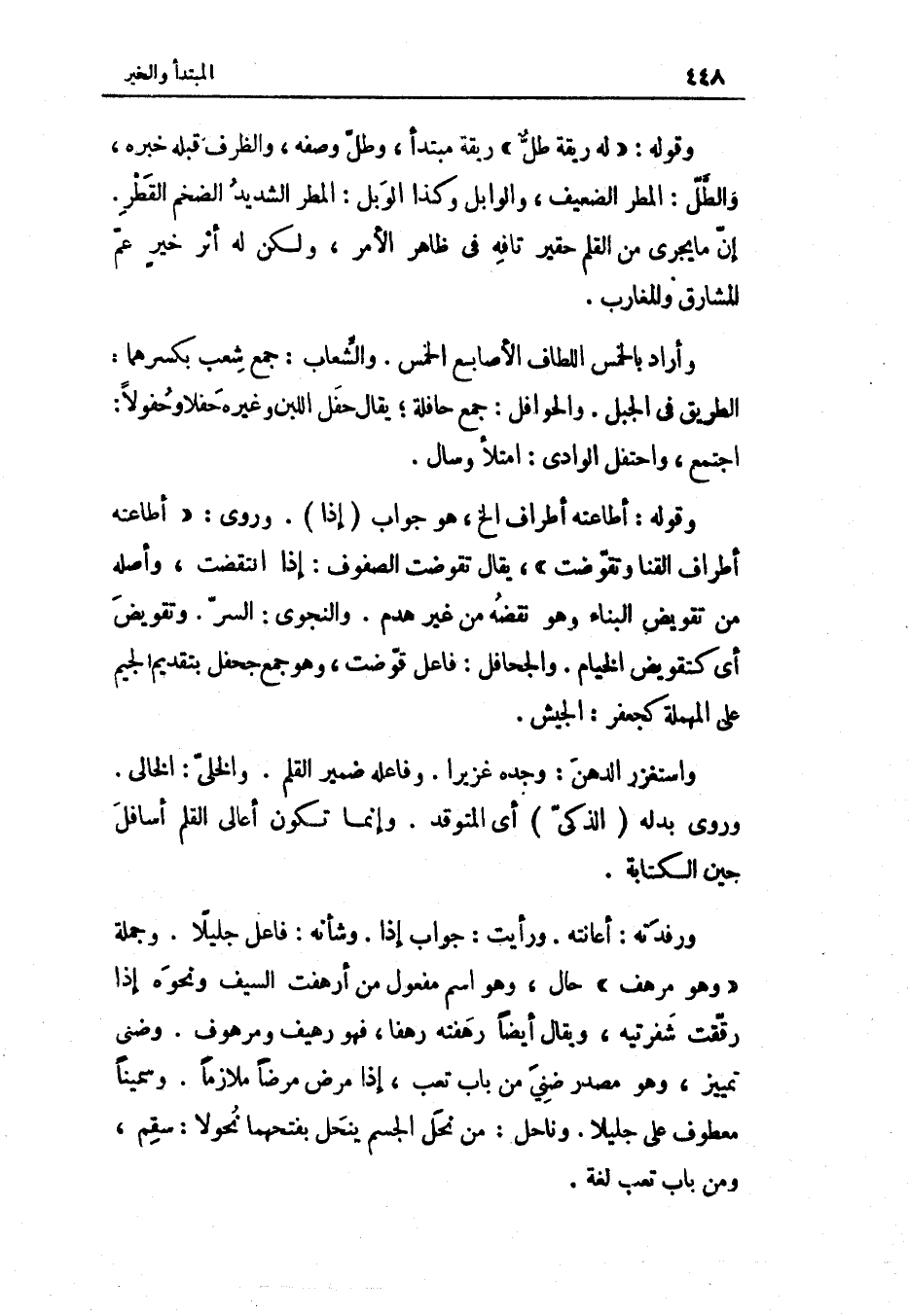 وَقَوله لَهُ ريقة طل ريقة مُبْتَدأ وطل وَصفه والظرف قبله خَبره والطل الْمَطَر الضَّعِيف والوابل وَكَذَا الوبل الْمَطَر الشَّديد الضخم الْقطر إِن مَا يجْرِي من الْقَلَم حقير تافه فِي ظَاهر الْأَمر وَلَكِن لَهُ أثر خير عَم الْمَشَارِق والمغارب وَأَرَادَ ب الْخمس اللطاف الْأَصَابِع الْخمس والشعاب جمع شعب بكسرهما الطَّرِيق فِي الْجَبَل والحوافل جمع حافلة يُقَال حفل اللَّبن وَغَيره حفلا وحفولا اجْتمع واحتفل الْوَادي امْتَلَأَ وسال وَقَوله أَطَاعَته أَطْرَاف إِلَخ هُوَ جَوَاب إِذا وروى أَطَاعَته أَطْرَاف القنا وتقوضت يُقَال تقوضت الصُّفُوف إِذا انتقضت وَأَصله من تقويض الْبناء وَهُوَ نقضه من غير هدم والنجوى السِّرّ وتقويض أَي كتقويض الْخيام والجحافل فَاعل قوضت وَهُوَ جمع جحفل بِتَقْدِيم الْجِيم على الْمُهْملَة كجعفر الْجَيْش واستغزر الذِّهْن وجده غزيرا وفاعله ضمير الْقَلَم والخلي الْخَالِي وروى بدله الذكي أَي المتوقد وَإِنَّمَا تكون أعالي الْقَلَم أسافل حِين الْكِتَابَة ورفدته أعانته وَرَأَيْت جَوَاب إِذا وشأنه فَاعل جَلِيلًا وَجُمْلَة وَهُوَ مرهف حَال وَهُوَ اسْم مفعول من أرهفت السَّيْف وَنَحْوه إِذا رققت شفرتيه وَيُقَال أَيْضا رهفته رهفا فَهُوَ رهيف ومرهوف وضنى تَمْيِيز وَهُوَ مصدر ضني من بَاب تَعب إِذا مرض مَرضا ملازما وسمينا مَعْطُوف على جَلِيلًا وناحل من نحل الْجِسْم ينْحل بفتحهما نحولا سقم وَمن بَاب تَعب لُغَة