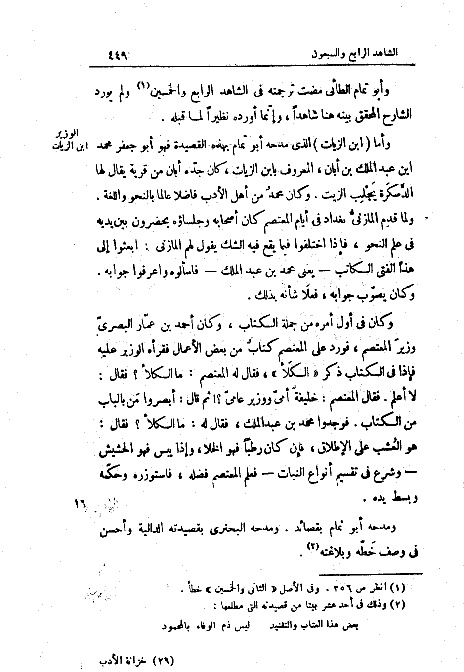 وَأَبُو تَمام الطَّائِي مَضَت تَرْجَمته فِي الشَّاهِد الرَّابِع وَالْخمسين وَلم يُورد الشَّارِح الْمُحَقق بَيته هُنَا شَاهدا وَإِنَّمَا أوردهُ نظيرا لما قبله وَأما ابْن الزيات الَّذِي مدحه أَبُو تَمام بِهَذِهِ القصيدة فَهُوَ أَبُو جَعْفَر مُحَمَّد بن عبد الْملك بن أبان الْمَعْرُوف بِابْن الزيات كَانَ جده أبان من قَرْيَة يُقَال لَهَا الدسكرة يجلب الزَّيْت وَكَانَ مُحَمَّد من أهل الْأَدَب فَاضلا عَالما بالنحو واللغة وَلما قدم الْمَازِني بَغْدَاد فِي أَيَّام المعتصم كَانَ أَصْحَابه وجلساؤه يحْضرُون بَين يَدَيْهِ فِي علم النَّحْو فَإِذا اخْتلفُوا فِيمَا يَقع فِيهِ الشَّك يَقُول لَهُم الْمَازِني ابْعَثُوا إِلَى هَذَا الْفَتى الْكَاتِب يَعْنِي مُحَمَّد بن عبد الْملك فَاسْأَلُوهُ واعرفوا جَوَابه وَكَانَ يصوب جَوَابه فعلا شَأْنه بذلك وَكَانَ فِي أول أمره من جملَة الْكتاب وَكَانَ أَحْمد بن عمار الْبَصْرِيّ وَزِير المعتصم فورد على المعتصم كتاب من بعض الْأَعْمَال فقرأه الْوَزير عَلَيْهِ فَإِذا فِي الْكتاب ذكر الْكلأ فَقَالَ لَهُ المعتصم مَا الْكلأ فَقَالَ لَا أعلم فَقَالَ المعتصم خَليفَة أُمِّي ووزير عَامي ثمَّ قَالَ أبصروا من بِالْبَابِ من الْكتاب فوجدوا مُحَمَّد بن عبد الْملك فَقَالَ لَهُ مَا الْكلأ فَقَالَ هُوَ العشب على الْإِطْلَاق فَإِن كَانَ رطبا فَهُوَ الخلا وَإِذا يبس فَهُوَ الْحَشِيش وَشرع فِي تَقْسِيم أَنْوَاع النَّبَات فَعلم المعتصم فَضله فاستوزره وَحكمه وَبسط يَده ومدحه أَبُو تَمام بقصائد ومدحه البحتري بقصيدته الدالية وَأحسن فِي وصف خطه وبلاغته