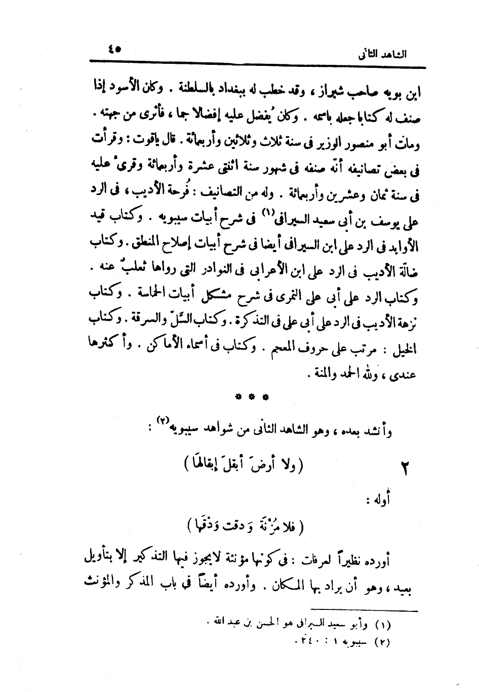 ابْن بويه صَاحب شيراز وَقد خطب لَهُ بِبَغْدَاد بالسلطنة وَكَانَ الْأسود إِذا صنف لَهُ كتابا جعله باسمه وَكَانَ يفضل عَلَيْهِ إفضالا جما فأثرى من جِهَته وَمَات أَبُو مَنْصُور الْوَزير فِي سنة ثَلَاث وَثَلَاثِينَ وَأَرْبَعمِائَة قَالَ ياقوت وقرأت فِي بعض تصانيفه أَنه صنفه فِي شهور سنة اثْنَتَيْ عشرَة وَأَرْبَعمِائَة وَقُرِئَ عَلَيْهِ فِي سنة ثَمَان وَعشْرين وَأَرْبَعمِائَة وَله من التصانيف فرحة الأديب فِي الرَّد على يُوسُف بن أبي سعيد السيرافي فِي شرح أَبْيَات سِيبَوَيْهٍ وَكتاب قيد الأوابد فِي الرَّد على ابْن السيرافي أَيْضا فِي شرح أَبْيَات إصْلَاح الْمنطق وَكتاب ضَالَّة الأديب فِي الرَّد على ابْن الْأَعرَابِي فِي النَّوَادِر الَّتِي رَوَاهَا ثَعْلَب عَنهُ وَكتاب الرَّد على أبي عَليّ النمري فِي شرح مُشكل أَبْيَات الحماسة وَكتاب نزهة الأديب فِي الرَّد على أبي عَليّ فِي التَّذْكِرَة وَكتاب السل وَالسَّرِقَة وَكتاب الْخَيل مُرَتّب على حُرُوف المعجم وَكتاب فِي أَسمَاء الْأَمَاكِن وأكثرها عِنْدِي وَللَّه الْحَمد والْمنَّة وَأنْشد بعده وَهُوَ الشَّاهِد الثَّانِي من شَوَاهِد سِيبَوَيْهٍ (المتقارب)