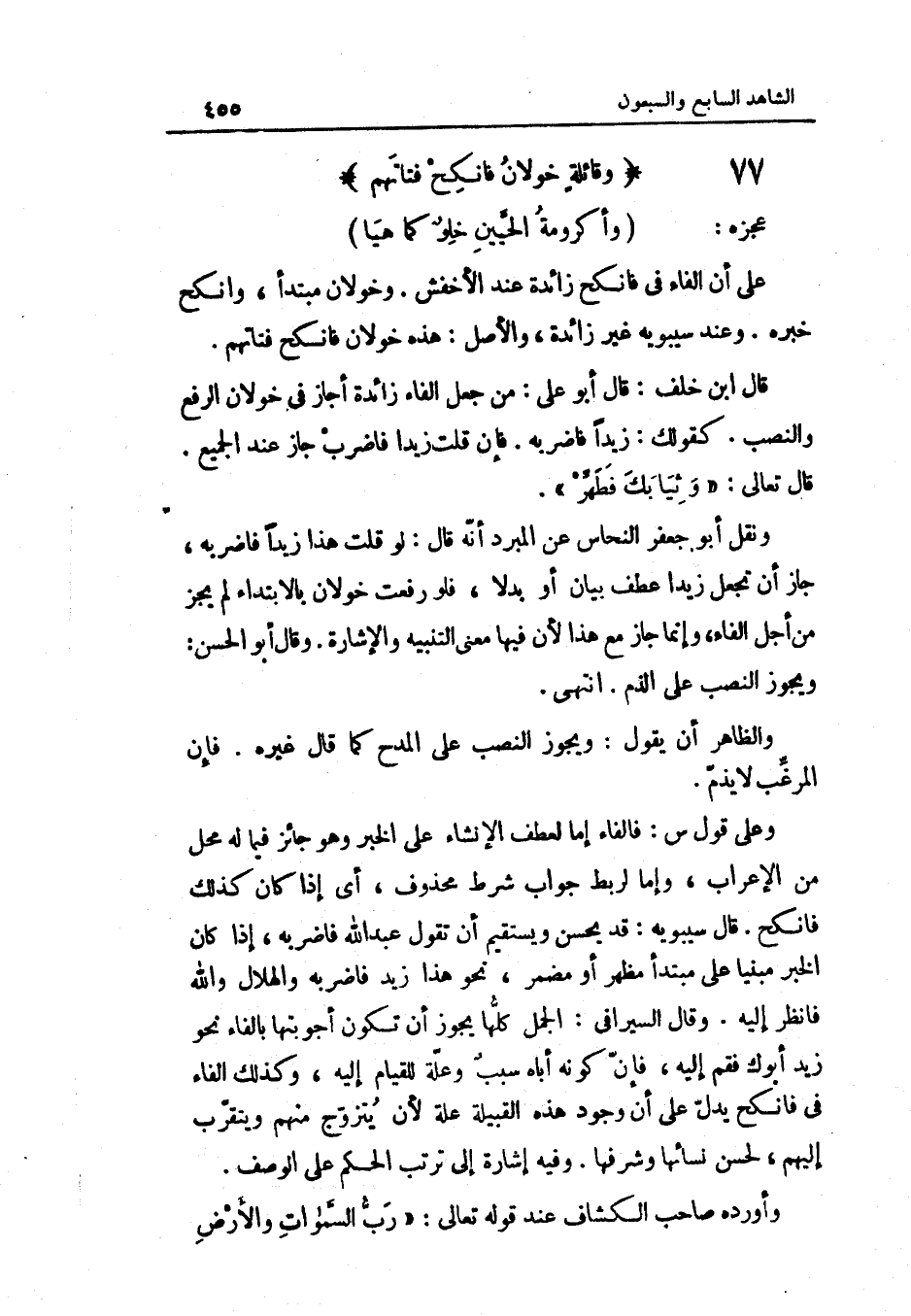على أَن الْفَاء فِي فانكح زَائِدَة عِنْد الْأَخْفَش وخولان مُبْتَدأ وانكح خَبره وَعند سِيبَوَيْهٍ غير زَائِدَة وَالْأَصْل هَذِه خولان فانكح فَتَاتهمْ قَالَ ابْن خلف قَالَ أَبُو عَليّ من جعل الْفَاء زَائِدَة أجَاز فِي خولان الرّفْع وَالنّصب كَقَوْلِك زيدا فَاضْرِبْهُ فَإِن قلت زيدأ فَاضْرب جَازَ عِنْد الْجَمِيع قَالَ تَعَالَى {وثيابك فطهر} وَنقل أَبُو جَعْفَر النّحاس عَن الْمبرد أَنه قَالَ لَو قلت هَذَا زيدا فَاضْرِبْهُ جَازَ أَن تجْعَل زيدا عطف بَيَان أَو بَدَلا فَلَو رفعت خولان بِالِابْتِدَاءِ لم يجز من أجل الْفَاء وَإِنَّمَا جَازَ مَعَ هَذَا لِأَن فِيهَا معنى التَّنْبِيه وَالْإِشَارَة وَقَالَ أَبُو الْحسن وَيجوز النصب على الذَّم انْتهى وَالظَّاهِر أَن يَقُول وَيجوز النصب على الْمَدْح كَمَا قَالَ غَيره فَإِن المرغب لَا يذم وعَلى قَول س فالفاء إِمَّا لعطف الْإِنْشَاء على الْخَبَر وَهُوَ جَائِز فِيمَا لَهُ مَحل من الْإِعْرَاب وَأما لربط جَوَاب شَرط مَحْذُوف أَي إِذا كَانَ كَذَلِك فانكح قَالَ سِيبَوَيْهٍ قد يحسن ويستقيم أَن تَقول عبد الله فَاضْرِبْهُ إِذا كَانَ الْخَبَر مَبْنِيا على مُبْتَدأ مظهر أَو مُضْمر نَحْو هَذَا زيد فَاضْرِبْهُ والهلال وَالله فَانْظُر إِلَيْهِ وَقَالَ السيرافي الْجمل كلهَا يجوز أَن تكون أجوبتها بِالْفَاءِ نَحْو زيد أَبوك فَقُمْ إِلَيْهِ فَإِن كَونه أَبَاهُ سَبَب وَعلة للْقِيَام إِلَيْهِ وَكَذَلِكَ الْفَاء فِي فانكح يدل على أَن وجود هَذِه الْقَبِيلَة عِلّة لِأَن يتَزَوَّج مِنْهُم ويتقرب إِلَيْهِم لحسن نسائها وشرفها وَفِيه إِشَارَة إِلَى ترَتّب الحكم على الْوَصْف وأرده صَاحب الْكَشَّاف عِنْد قَوْله تَعَالَى {رب السَّمَاوَات وَالْأَرْض