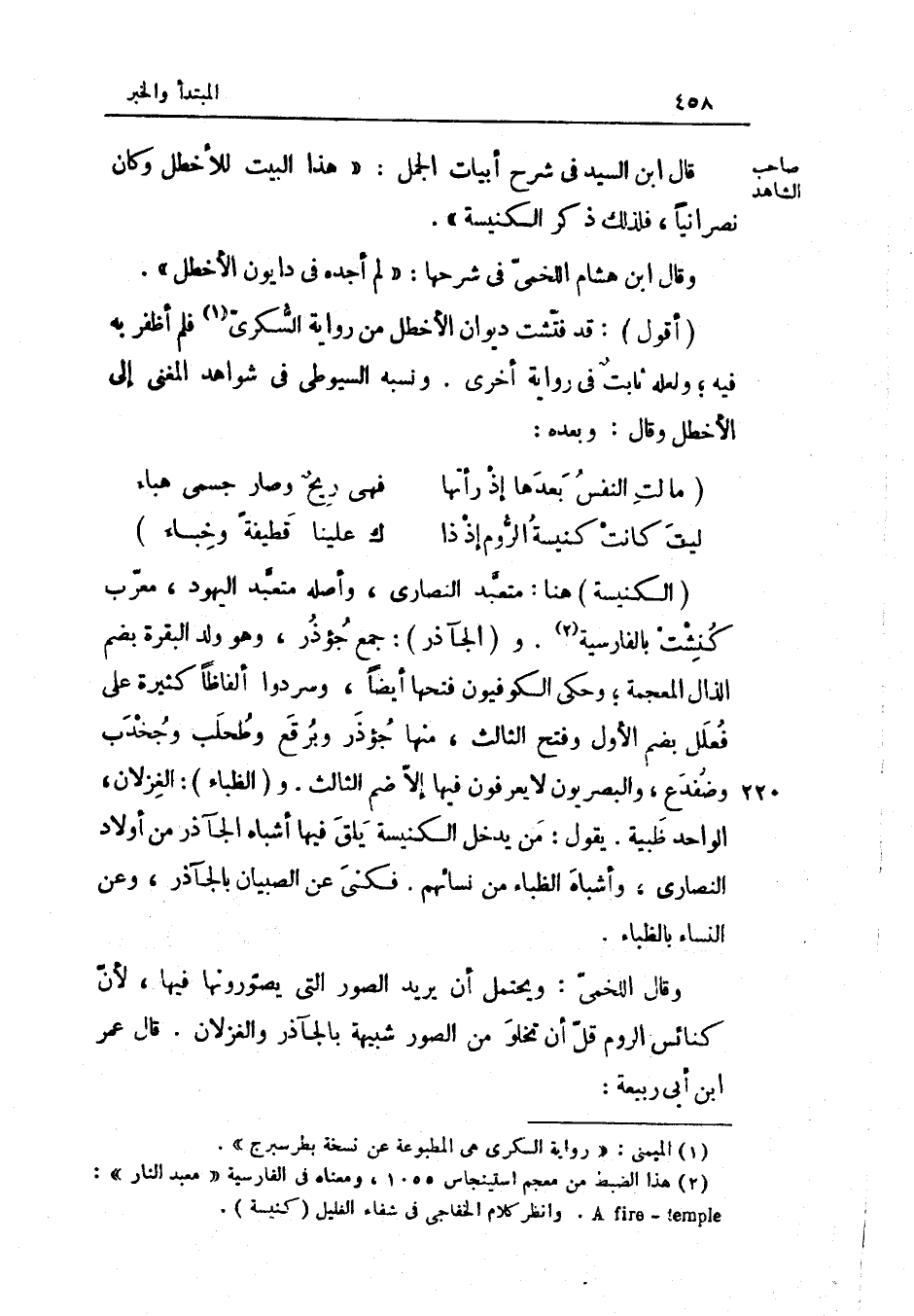 قَالَ ابْن السَّيِّد فِي شرح أَبْيَات الْجمل هَذَا الْبَيْت للأخطل وَكَانَ نَصْرَانِيّا فَلذَلِك ذكر الْكَنِيسَة وَقَالَ ابْن هِشَام اللَّخْمِيّ فِي شرحها لم أَجِدهُ فِي ديوَان الأخطل أَقُول قد فتشت ديوَان الأخطل من رِوَايَة السكرِي فَلم أظفر بِهِ فِيهِ